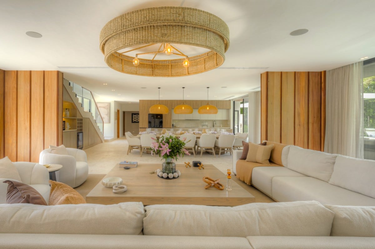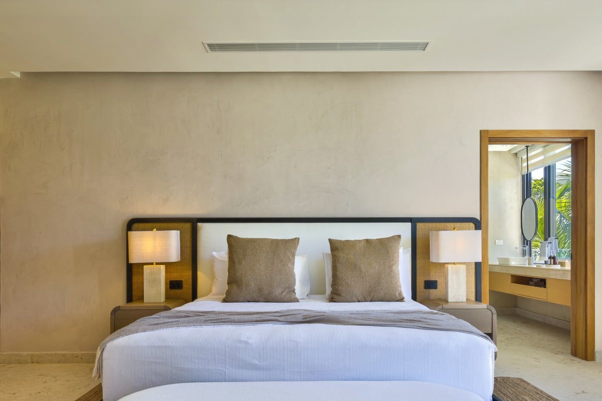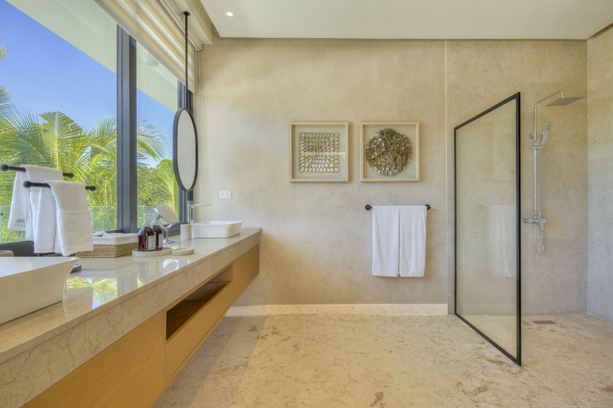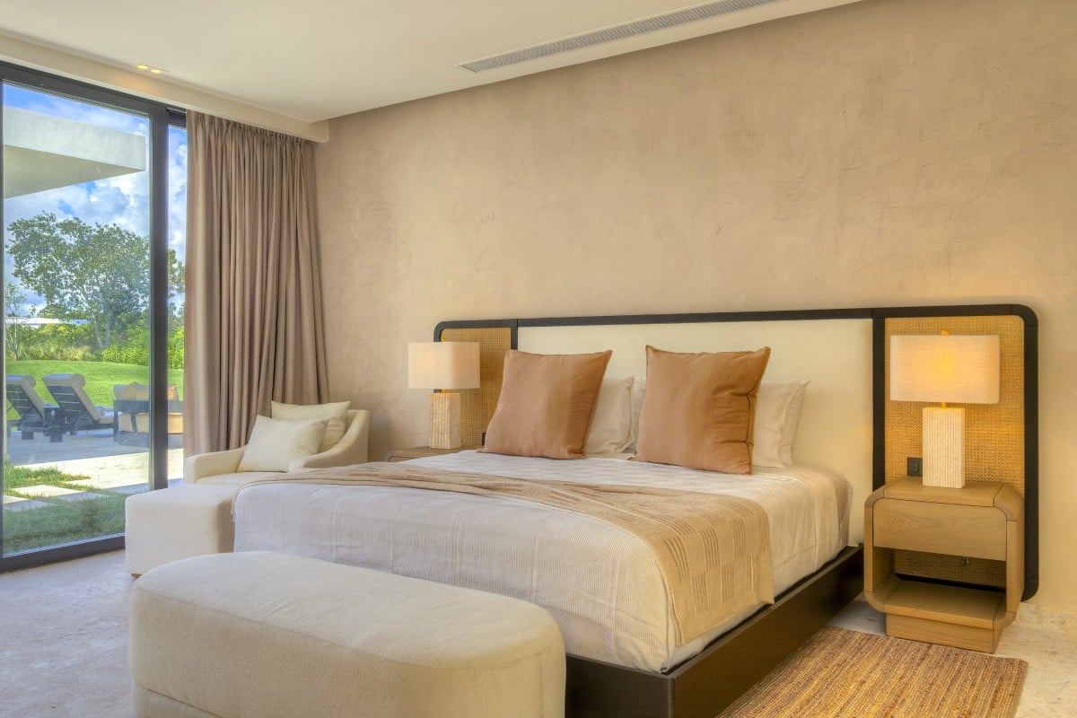From the moment you enter, you are greeted by refined minimalism and a chic Caribbean ambiance. Expansive ceilings, open flow layouts, and wide glass doors create a seamless transition between the villa’s stylish interiors and the lush natural surroundings. Earthy textures, natural wood finishes, and soft airy tones set the stage for a laid back yet polished tropical lifestyle.