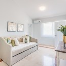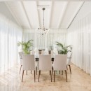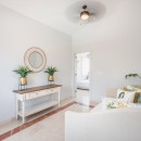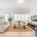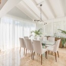 Inside, the villa features an open-concept living space with high ceilings and large windows that let in plenty of natural light. The living room is furnished with soft, inviting sofas and armchairs, creating a warm and comfortable atmosphere where guests can unwind and enjoy each other's company.