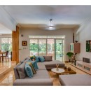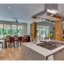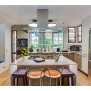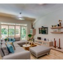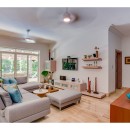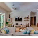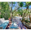 Upon entering through the main doorway, guests are enveloped in an atmosphere of eccentricity and positivity, thanks to the modern, colorful, and eclectic decor. Moving from the main foyer to the living area, one can enjoy a sweeping view of the garden and pool area. The comfortable sitting area invites everyone to unwind, whether it's for a movie night or relaxation after a day at the beach. Continuing the open concept, the dining area is located on the left, adjacent to the gourmet kitchen featuring a contemporary island and gleaming marble countertops.