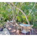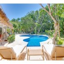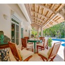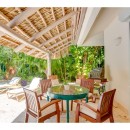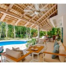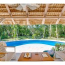The highlight of the villa is the outdoor experience, as guests step onto the patio under a thatched roof, equipped with a spacious outdoor living area and alfresco dining space. The Coraline deck leads to a refreshing swimming pool, and the secluded corner, surrounded by evergreen palms, provides the perfect spot to unwind in the shade while sipping on a refreshing cocktail.