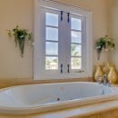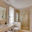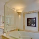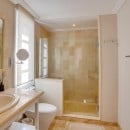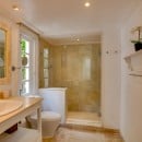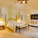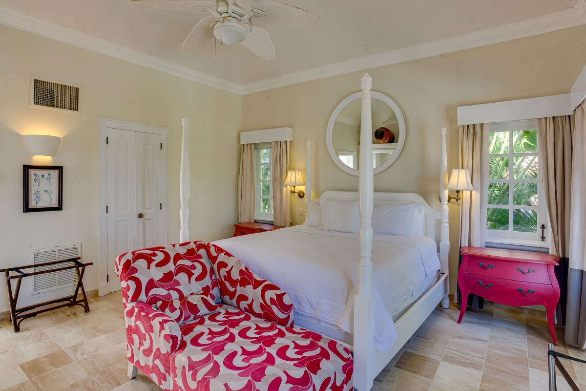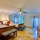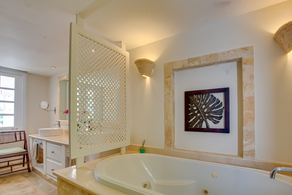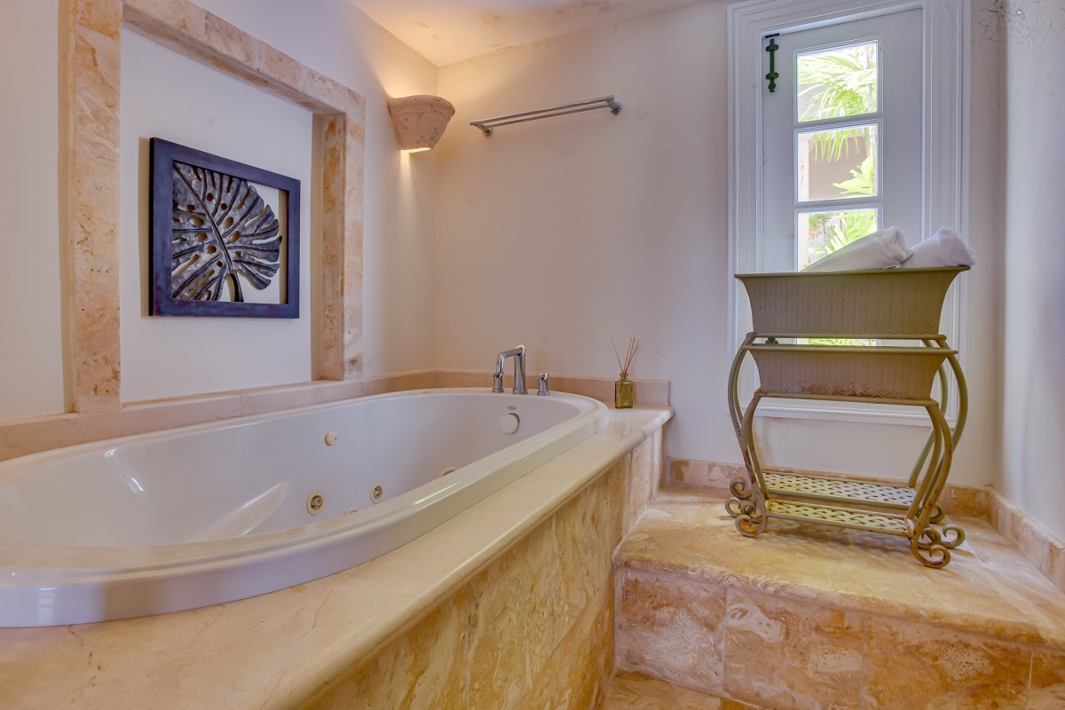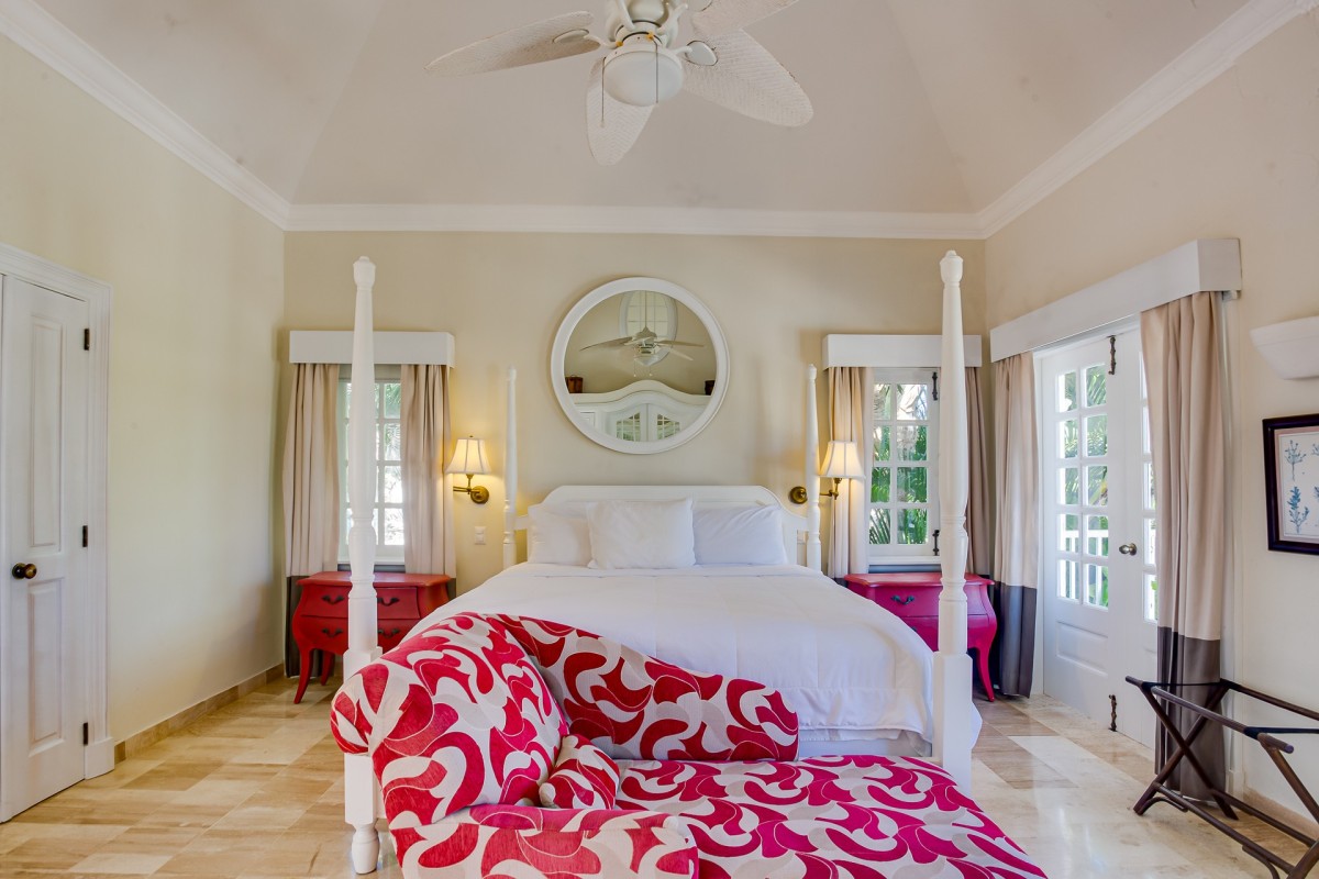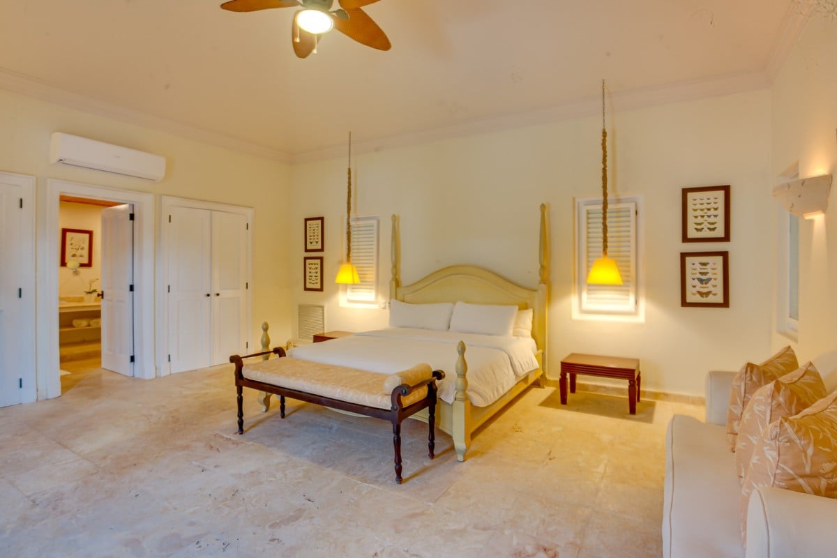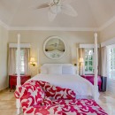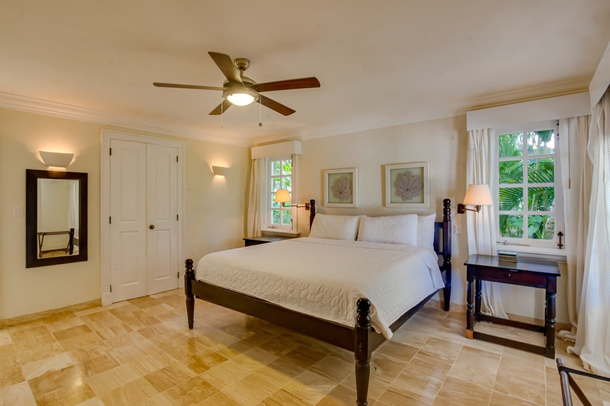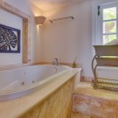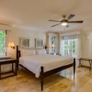 Bedroom 5: Ground floor bedroom with a king-size bed, A/C, ceiling fan, WiFi, safe, and en-suite bathroom with bathtub, shower, double vanity and WC. 2 guests maximum.