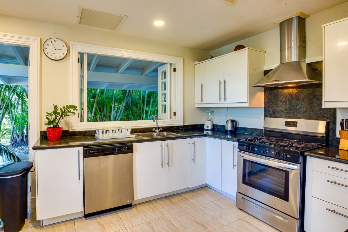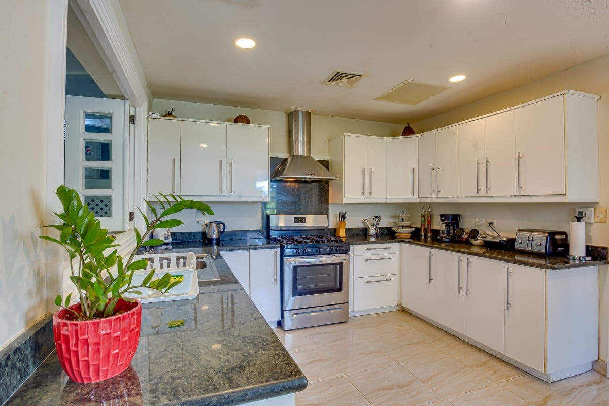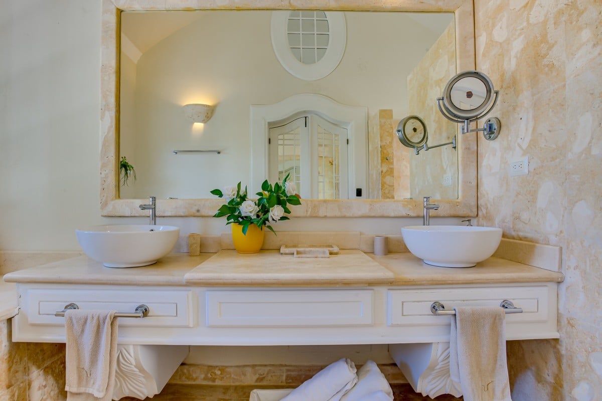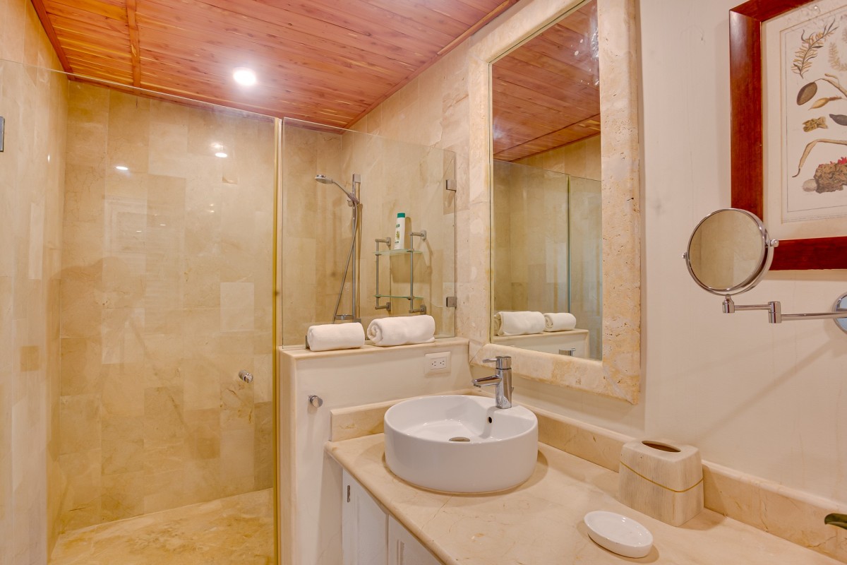 The great room offers formal dining alongside a truly elegant living room and entertainment space. The premium, gourmet kitchen stands ready to prepare even a complex meal or drink, and the bedrooms are private paradises of their own. Divided between the main villa and a guest house, they include a master suite on the upper level, with private bath and terrace. There is another upper level suite, and two lower level bedrooms. Each is ensuite. The guest house contains a king suite with private bath and terrace.