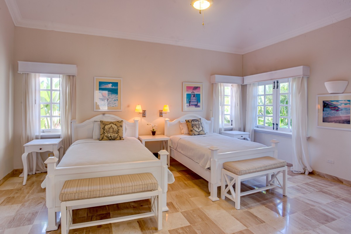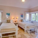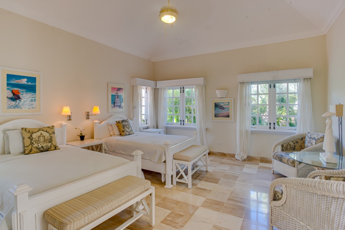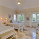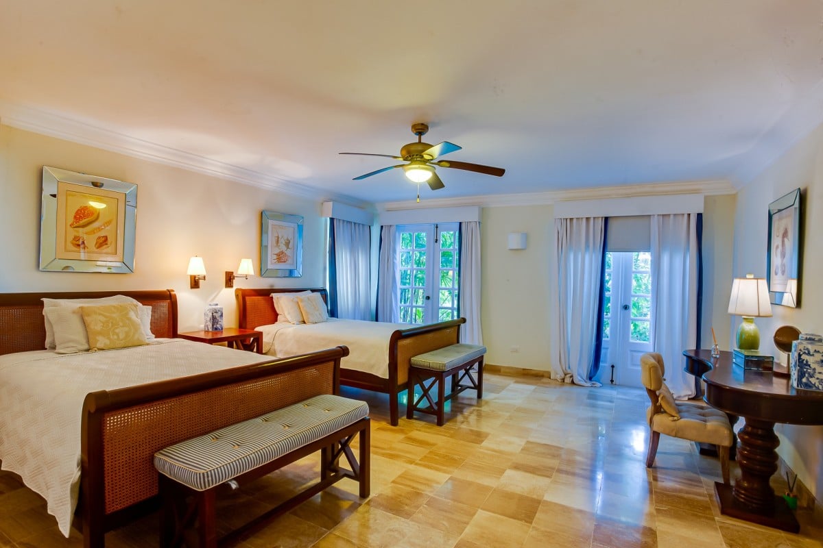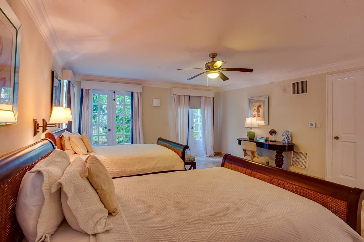 Bedroom 4: Ground floor bedroom with 2 double beds, A/C, ceiling fan, WiFi, safe, and en-suite bathroom with shower, double vanity and WC. 2 guests maximum.