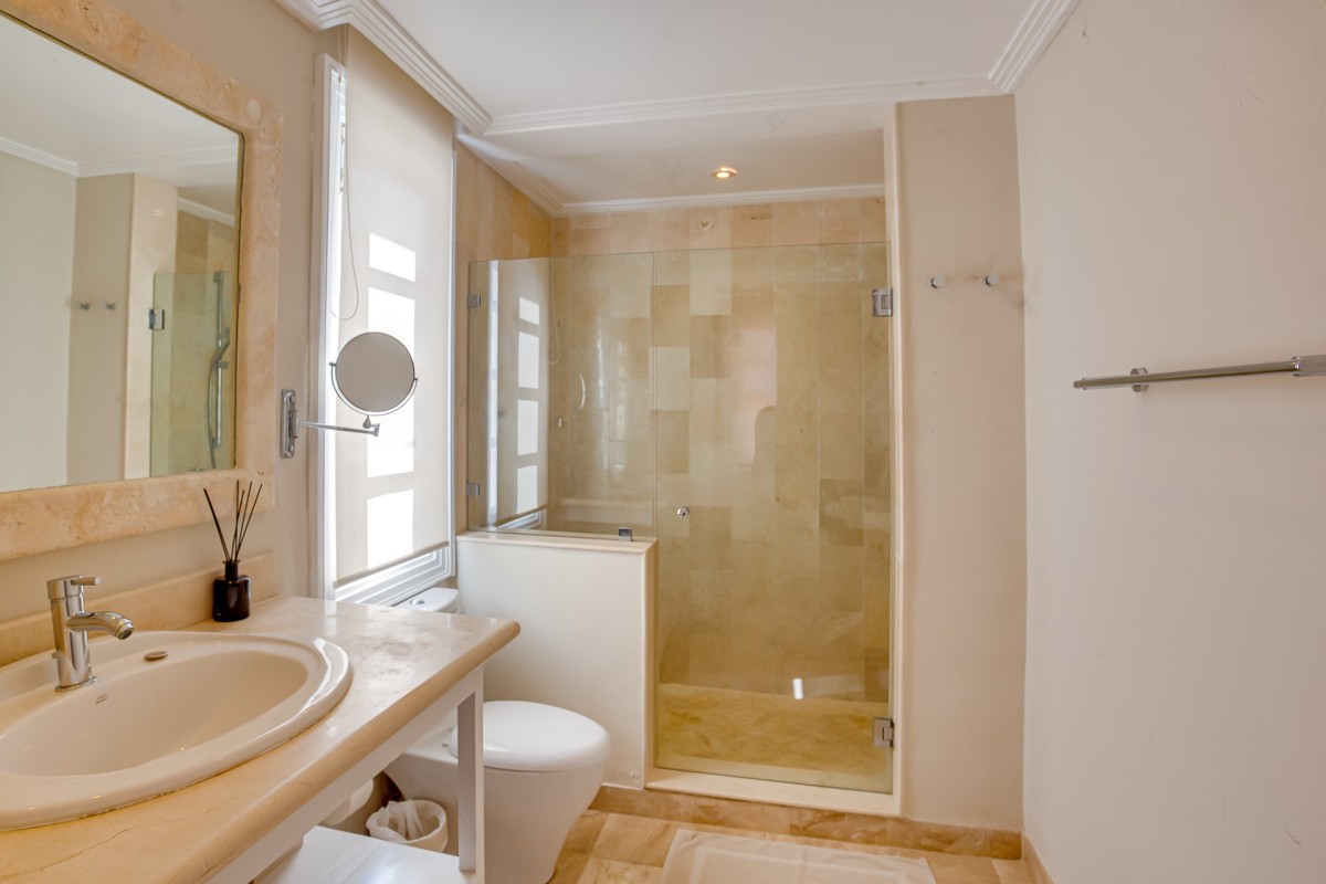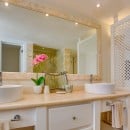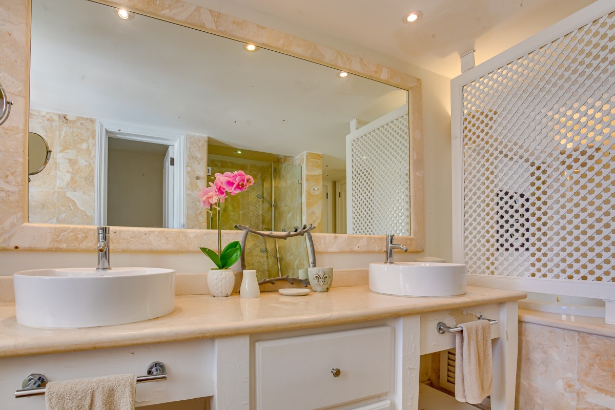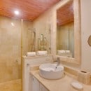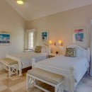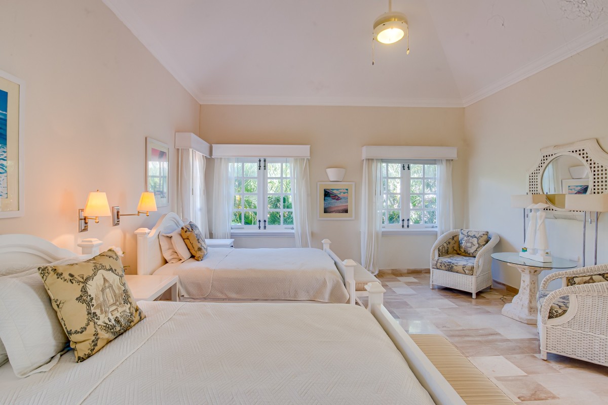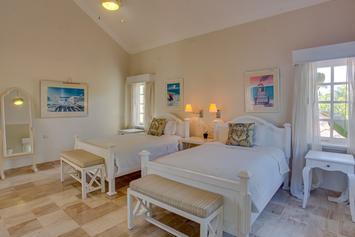 Bedroom 4: Ground floor bedroom with 2 double beds, A/C, ceiling fan, WiFi, safe, and en-suite bathroom with shower, double vanity and WC. 2 guests maximum.