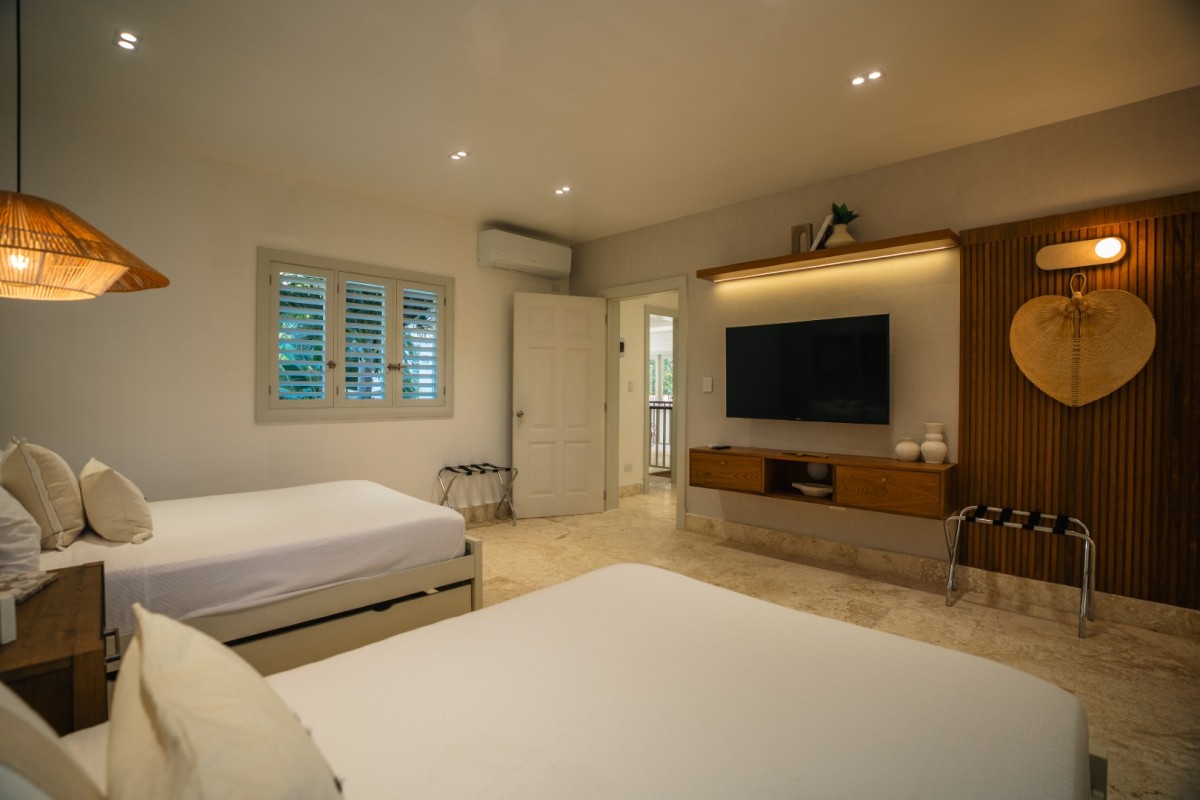 Bedroom 5: Bedroom with two queen-size beds, A/C, TV, WiFi, and en-suite bathroom with shower, vanity and WC. 2 guests maximum.