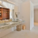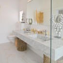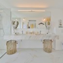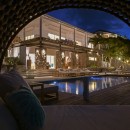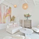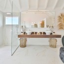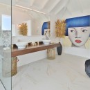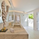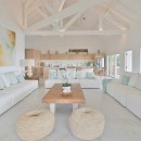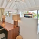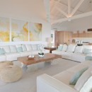 A spacious property, it features a stunning number of shared living spaces indoors and outdoors. Steps inside the bank of glass doors from the al fresco lounge beneath the portico and you enter the exotically furnished great room. With its white beams, high ceilings and large, white banquette sofas it is livened up with darkly stained wooden accent pieces, richly colored rugs, and impressive décor. It contains a living room area and leads you up to a home theater space and work area above.