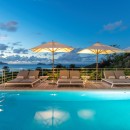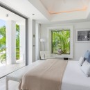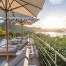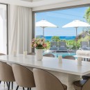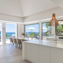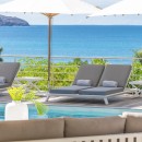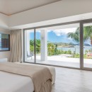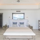 For many, the place to begin is the infinity-edge pool that frames one area of the outdoor living spaces. Flanked by a large sun deck, the pool spills over into a smaller pool on the next level below. The upper level of the villa also features many of the shared living spaces, such as the stunning gourmet kitchen and the beautifully decorated living room. A formal dining space is at this level. The focus throughout is the amazing scenery and the spaces manage to capture the light and sea breezes while inducing a sense of calm and relaxation.