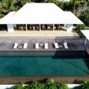 The heart of the property is the large pool with its wooden terrace. This has been furnished with an array of sun beds that let you savor the views in complete comfort. At one end of the pool, a large pergola serves as an enormous outdoor lounge with rattan and wooden banquettes upholstered in a tranquil cream. Running the length of the pool is a terrace-like structure that is actually the indoor shared living spaces.