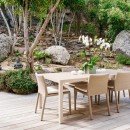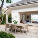 Most guests, however, find themselves endlessly drawn to the front of the villa as this is where the infinity edge pool is found. Set on the ground level, it is reached from an upper sun deck that opens directly into the great room. The pool is framed by a wooden deck and furnished with a wide array of lounges and sun beds. Heading up to the sun deck, you find al fresco living room and dining spaces.