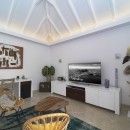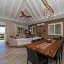 The inside of the villa has a modern open floor plan that is air-conditioned for comfort. It has a living area with views of the water, a nook for watching satellite television or Apple TV, and a modern dining and cooking area. Two of the three bedrooms are located across from each other on opposite sides of the living room. Each has a queen bed and lots of storage space.