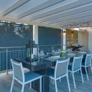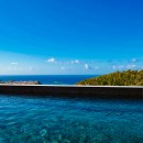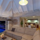 As you make your way along the terrace you find another outdoor lounge area beneath the portico, and in front of this is the amazing infinity edge swimming pool. Because the property is surrounded by mature growth, the entire terrace feels as if it is framed by palms, and yet this does not impede the scenery in any way.