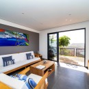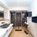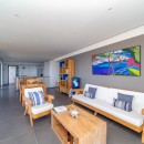 At one end is a sunken lounge and another features a sun deck. Step in through any of the immense glass doors to enter the great room. This open floor planned space is done with stone floors and a soothing sea blue palette that features honey stained wooden furnishings, creamy blues and bursts of tropical color. There is an immense, gourmet kitchen that opens to the terrace, a large dining room and an equally large living room. This opens to two areas of the terrace and offers stunning views.