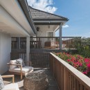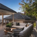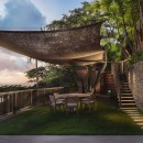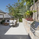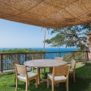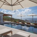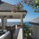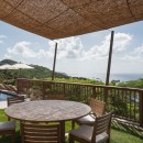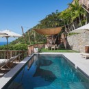 Villa Esprit De Roche boasts luxurious outdoor spaces across two levels. The covered terrace on the main level leads to a wooden staircase, descending to the second level where a stunning sparkling swimming pool awaits. Lounge chairs with umbrellas are strategically placed, offering a comfortable spot to relax and soak up the panoramic ocean views. Adjacent to the pool, a lovely green lawn hosts a shaded dining table. The presence of large trees on the property adds a unique charm, providing strength and a refreshing atmosphere, particularly when the glowing sunsets illuminate the infinite ocean.