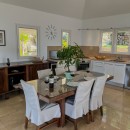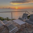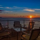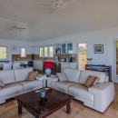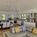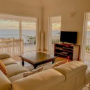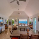 The stylish, open-plan living area features cozy sofas and a flat-screen TV, all oriented toward the spacious terrace where the endless ocean horizon takes center stage. A modern, fully equipped kitchen and a chic dining area for up to six guests share the space, with natural breezes flowing throughout.