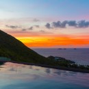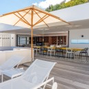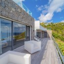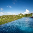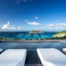 The covered outdoor dining area is an entertainer’s dream, featuring a striking table that seats up to 18 guests—set against the backdrop of the sparkling Caribbean Sea. The spacious wooden terrace also boasts a magnificent 17-meter heated infinity pool, perfectly positioned for sunbathing or stargazing on nearby loungers and daybeds. A separate whirlpool tub offers a tranquil spot to soak while admiring the sweeping views.