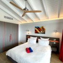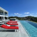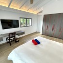 This vacation rental villa features five air-conditioned bedrooms, each with its own en-suite bathroom. The master bedroom, located on the upper level, opens onto an incredible ocean view. Two other bedrooms are situated on the lower level, in proximity to the terrace with the pool, while the fifth bedroom is housed in a separate bungalow. All bedrooms are spacious and comfortable, adorned with bright lighting and furnished with king-size beds, except for one room with twin beds. The refined ambiance, accentuated by touches of red throughout the villa, provides the perfect setting to unwind amidst the beauty of the Caribbean.