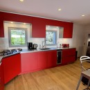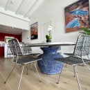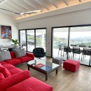 Nestled in the hills and recently renovated with upscale materials, Villa Voyage spans two levels. On the first floor, you'll discover the air-conditioned living room, featuring a lounge area with a vibrant red sofa and armchairs. The generous openings allow for panoramic views of the surrounding environment and the ocean. Adjacent to the living room is a well-equipped kitchen with a breakfast bar and a dining area. The elegant decor, with hints of red and sleek lines, creates a serene atmosphere against the backdrop of the panoramic views of Colombier's hills, the ocean, the neighboring islands, and Gustavia's harbor.