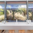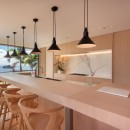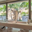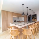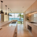 In a separate structure, the capacious kitchen, rendered in soothing cream tones, is thoughtfully equipped for culinary endeavors or the services of a private chef. It features a chic bar with six high-backed chairs complemented by modern pendant lighting—a delightful place to engage in conversation and relaxation while gazing out at the ocean. An outdoor barbecue facility is also at your disposal.