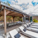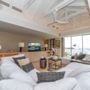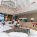 The interior decor exudes simplicity and minimalism, creating a serene and inviting ambiance. The air-conditioned living room, adorned in neutral and luminous hues, offers plush seating with generous sofas adorned with an abundance of pristine white and beige cushions—a perfect setting for indulging in delightful movie nights. Beyond the sheltered terrace, an alfresco dining area awaits, accommodating up to eight guests around an elegant wooden table, where one can relish open-air dining experiences alongside an inviting outdoor lounge space.