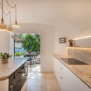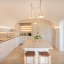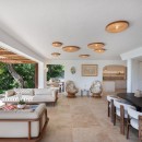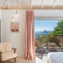 Spanning multiple levels, La Bulle showcases stunning vistas of Corossol’s crystal-clear waters and the villa’s vibrant flowering shrubs. The spacious living area seamlessly connects to the terrace, creating an elegant and refined atmosphere. A cozy lounge, adorned with botanical-print sofas and armchairs, sits beside the dining area, which comfortably seats eight. The fully equipped kitchen, complete with a central island, opens onto the terrace, where panoramic ocean views enhance the villa’s serene and private ambiance.
