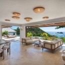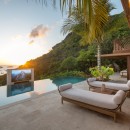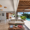 The outdoor space is a true celebration of Caribbean beauty. The magnificent heated infinity pool appears to blend into the turquoise sea, while plush sun loungers and cushioned benches invite relaxation under the sun. A shaded lounge area provides the perfect spot to enjoy the sea breeze, and a large HD screen near the pool sets the scene for memorable outdoor movie nights. A charming pergola extends the living space, adding to the villa’s idyllic and romantic charm. At the terrace’s edge, a rustic wooden dining table offers the perfect setting for al fresco dinners under the gentle trade winds.