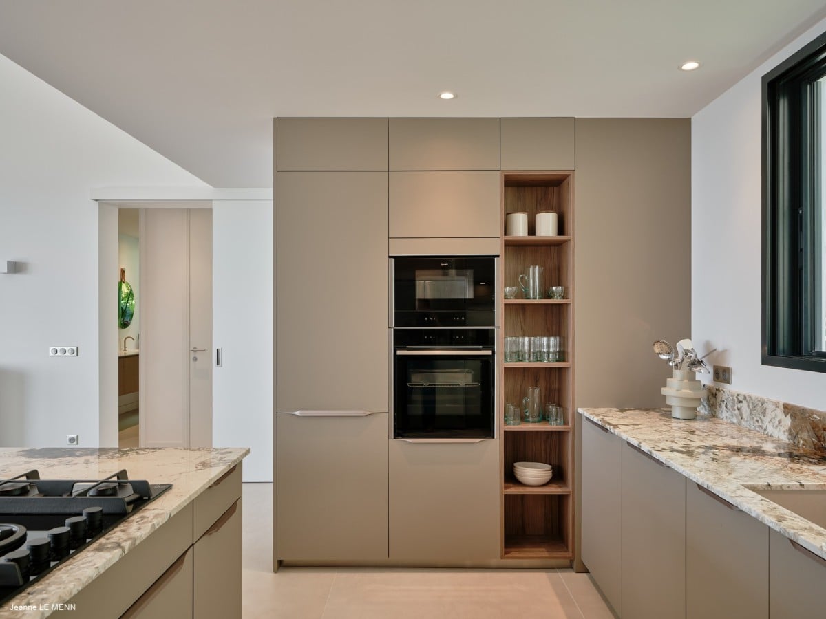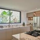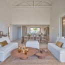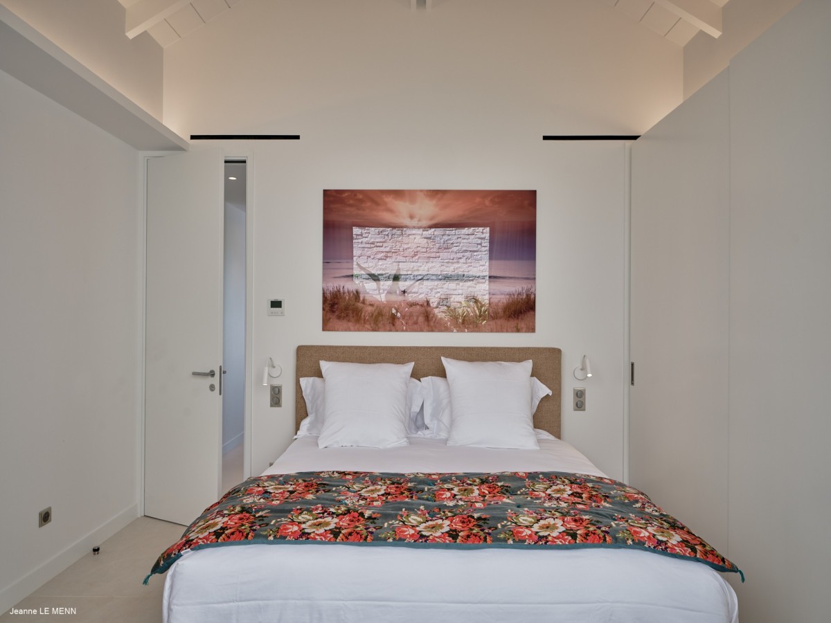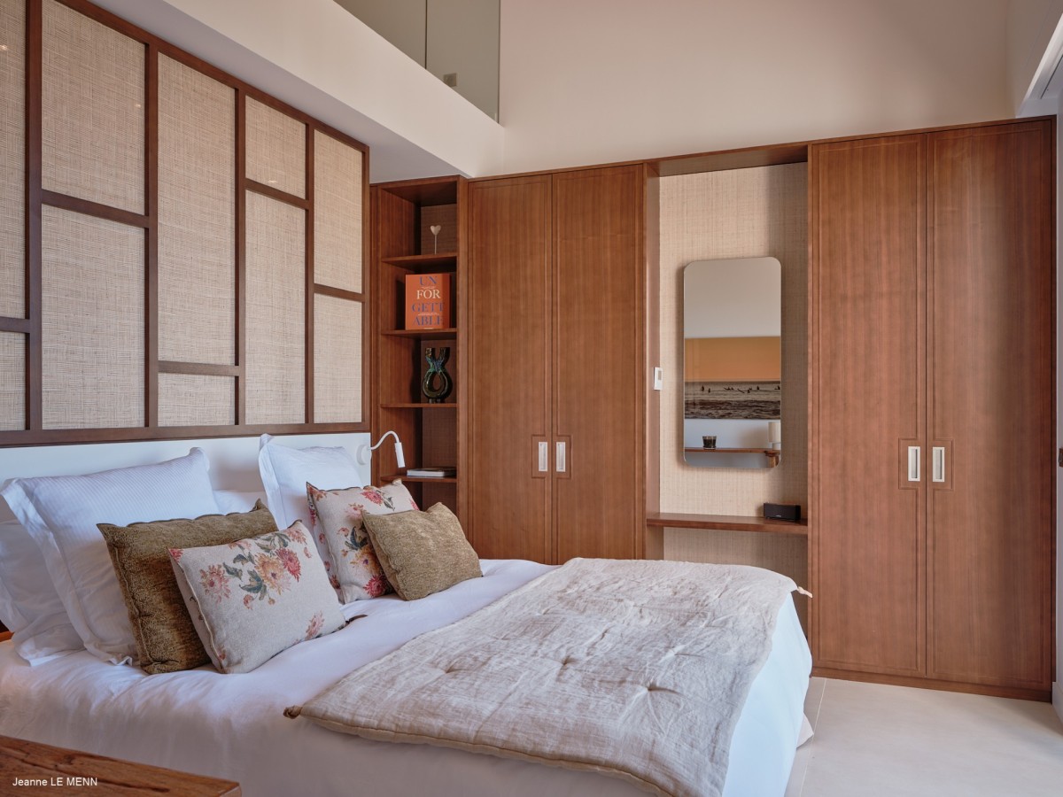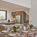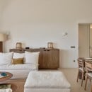 Inside, the villa showcases a minimalist, contemporary design with white and wood tones, high ceilings, and natural materials that fill each room with light and space. Clean lines and thoughtful details create a warm, modern, and welcoming atmosphere.