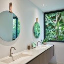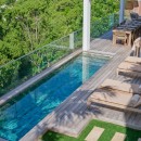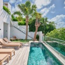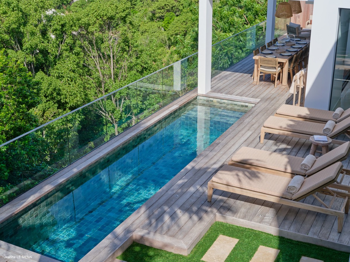 The sunlit terrace and pool area are perfect for relaxing, sunbathing, or enjoying meals al fresco amid lush tropical surroundings. The outdoor spaces, framed by local vegetation, ensure both privacy and tranquility while highlighting the villa’s scenic beauty.