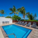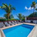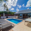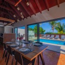Step outside onto the expansive terrace, where the breathtaking panorama of Flamands Beach unfolds before you. Lounge by the sparkling pool on sun-drenched chairs or enjoy alfresco dining in the shaded outdoor dining area, perfect for memorable meals under the island sky. The charming outdoor lounge, furnished with woven fiber sofas and chairs, is the ideal setting for sipping cocktails while soaking in the tropical atmosphere. A private gate leads directly onto the powdery sand, allowing for effortless beachside bliss.