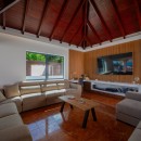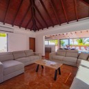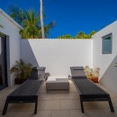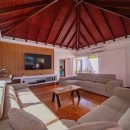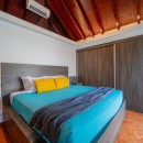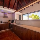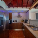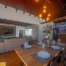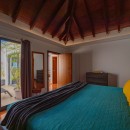 Designed on a single level to maximize the stunning seascape, the villa’s bright and inviting living space is divided into two distinct areas. The cozy lounge, featuring plush sofas and an HD screen, opens onto a serene indoor courtyard, while the dining area—designed for four—seamlessly connects to the terrace. The fully equipped kitchen, with its elegant vaulted ceiling and exposed dark wood beams, offers an inspiring view of the ocean, creating a warm and welcoming ambiance enhanced by the gentle Caribbean breeze.