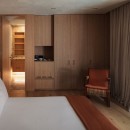 Down a discreet corridor lie four guest suites on a lower level, each opening onto the garden and offering sweeping sea views. At the far end, the sumptuous master suite boasts extra space, a private dressing room, and its own outlook across the bay. A fifth bedroom, set apart by the poolside stairwell, provides absolute seclusion beside the fitness studio—ideal for those seeking complete privacy.