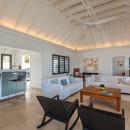Guests will also be able to enjoy the ever-changing skies and stunning views from the interior spaces as well. There is a classic great room just off the terrace, and it features the traditional white walls and high white wooden ceiling paired with sand-hued stone floors. Decorated in a blend of contemporary and island-classic pieces it uses accents of black and brown to create a welcoming setting for the living room and TV lounge. Nearby is the modern and spacious kitchen, which uses a stainless and black color scheme to create a bright and chic setting to prepare meals of any kind. Open to the views, it is furnished with premium brand appliances and is ideal for even experienced cooks. It opens to the rear terrace where a patio and barbecue are found.