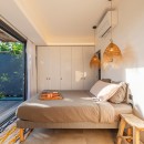 Two beautifully designed bedrooms promise a restful night’s sleep. The master suite includes a king-size bed (200×200), a private bathroom with a striking black bathtub, plus both indoor and outdoor showers. A separate dressing area offers plenty of storage and a washing machine. Adjacent to this room, or accessible via the terrace, is a second bedroom with its own closet and a small bathroom with a shower.