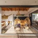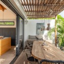 A staircase leads to an expansive deck featuring a two-level pool and comfortable seating—perfect for lounging or soaking up the sun. With automated sliding doors, the villa effortlessly blends indoor and outdoor living. The airy main living area is complemented by high ceilings, air conditioning, an open kitchen with a breakfast bar, two relaxing swing chairs, a dining area (with an outdoor dining option), and a cozy lounge with a smart TV, computer, and sound system.