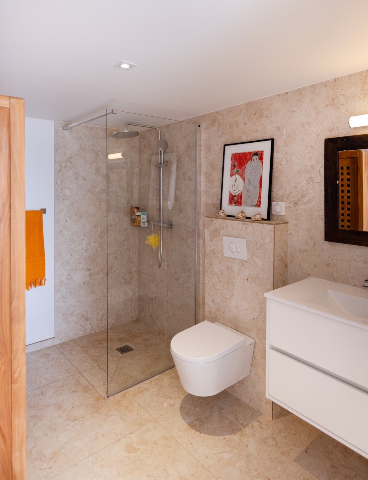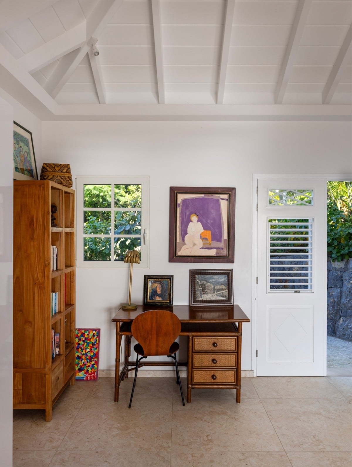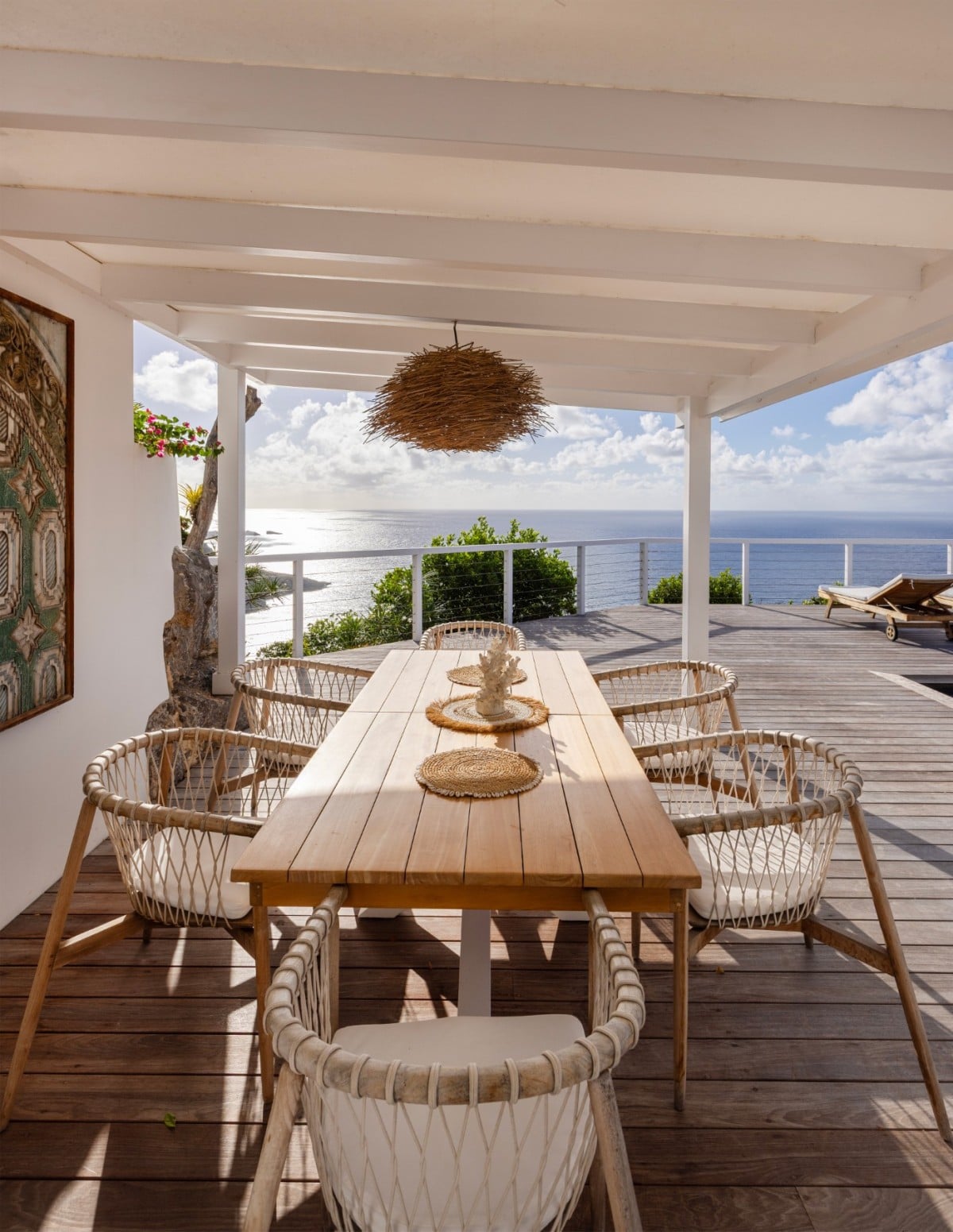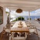 Outside, the terrace reveals sweeping views of the deep blue Caribbean waters. At its heart, the swimming pool faces the horizon and is surrounded by a wooden deck furnished with sun loungers, ideal for moments of pure relaxation. A covered outdoor dining area for six guests sits beside a comfortable lounge space, decorated with natural materials that add to the villa’s calm and romantic ambiance. A lower terrace, just a few steps away, offers an additional private nook with seating, perfect for quietly admiring the panoramic scenery.