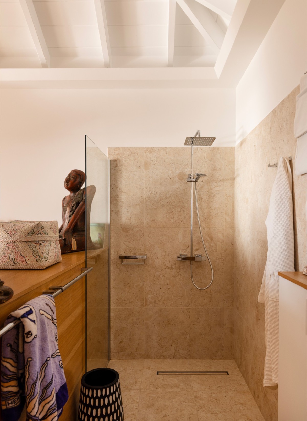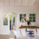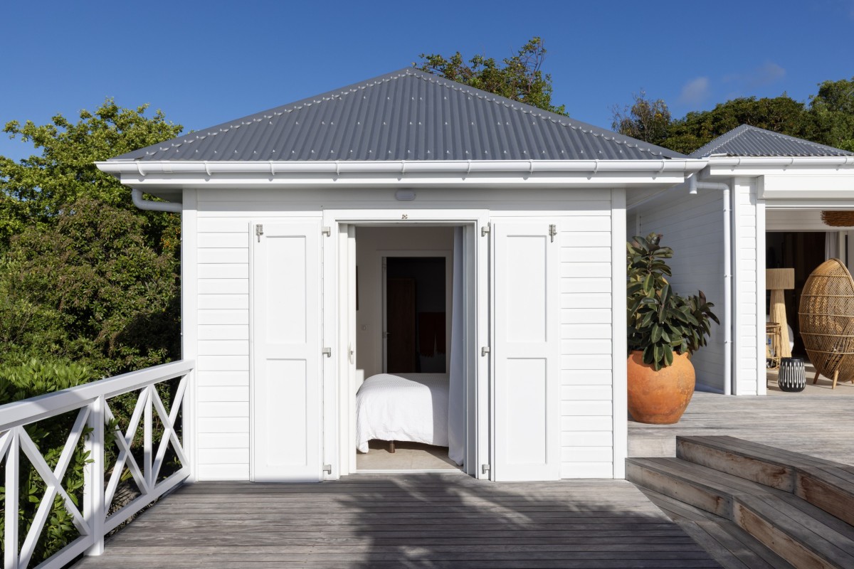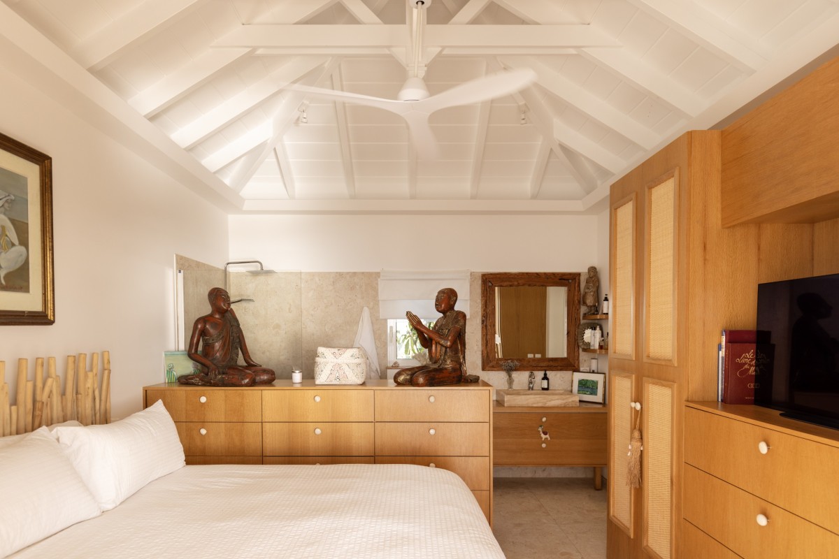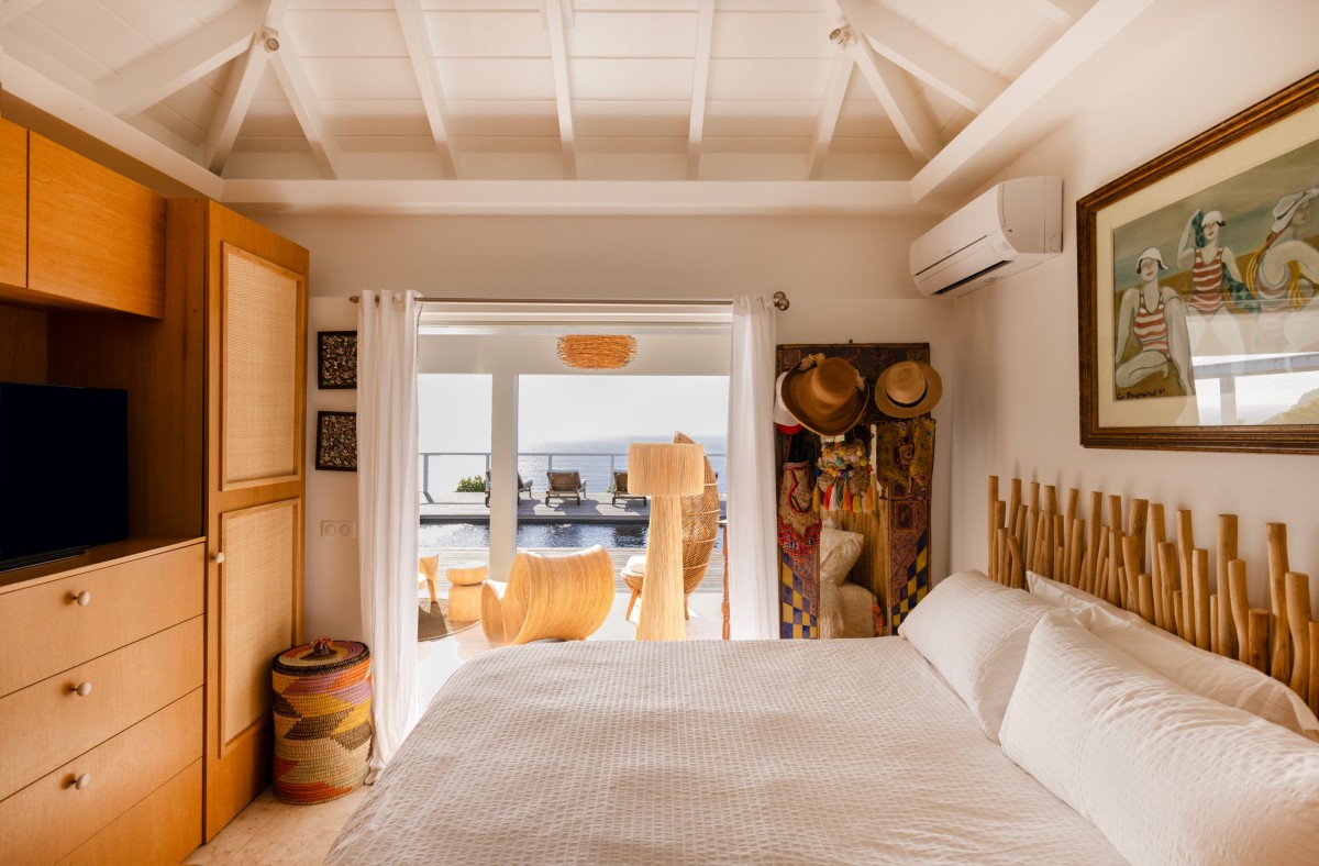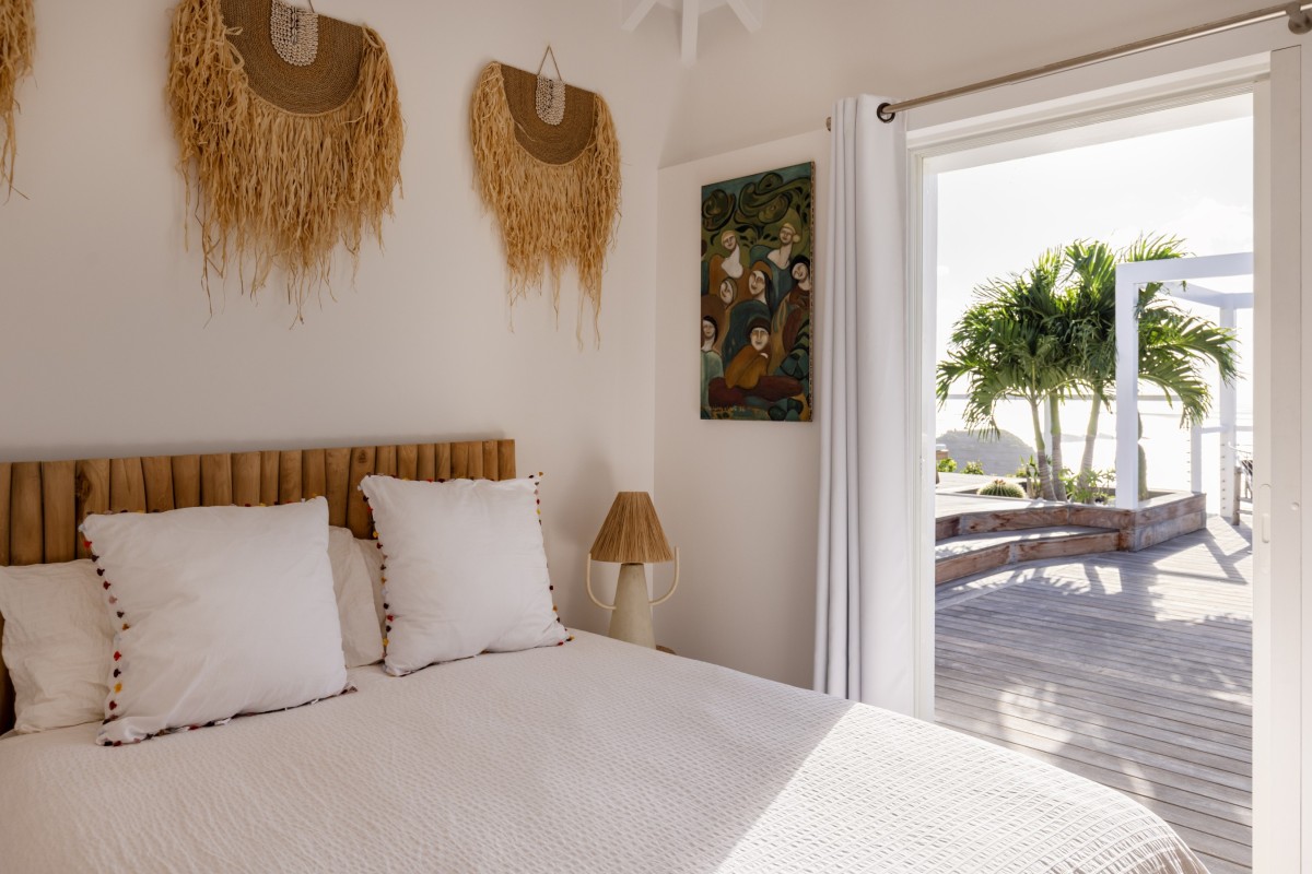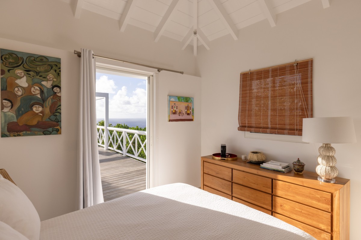 Villa Oceane features two air-conditioned bedrooms, each with a queen-size bed and en-suite bathroom. One bedroom is located in the main building, while the second occupies a separate bungalow, providing enhanced privacy. Decorated in soft tones with natural wood accents, both bedrooms open onto the terrace and share the same extraordinary ocean view, offering a peaceful haven after days spent discovering the beauty of St-Barths.