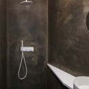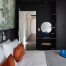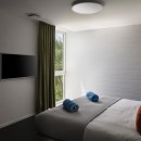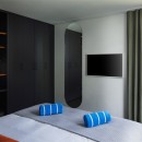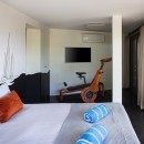 A third bedroom, located on the lower level, is accessible by stairs from the terrace or via a private pathway from the parking area. Slightly smaller than the other two, this room offers a queen-size bed (160×200) and a private entrance, making it perfect for teenagers or single guests. It includes its own terrace, indoor and outdoor showers, and a fitness machine in an air-conditioned area. The bed can also be tucked away, transforming the room into a home gym for added flexibility.