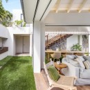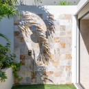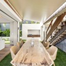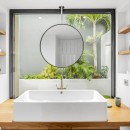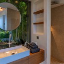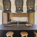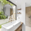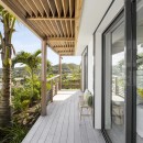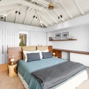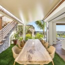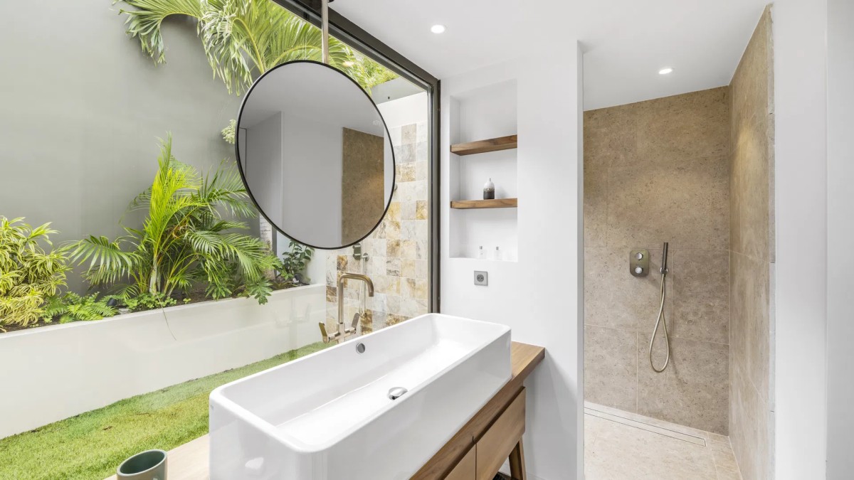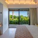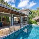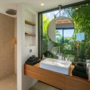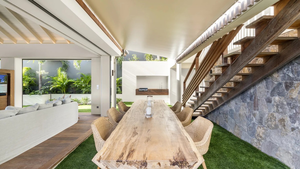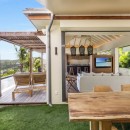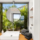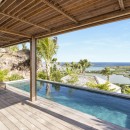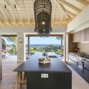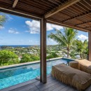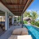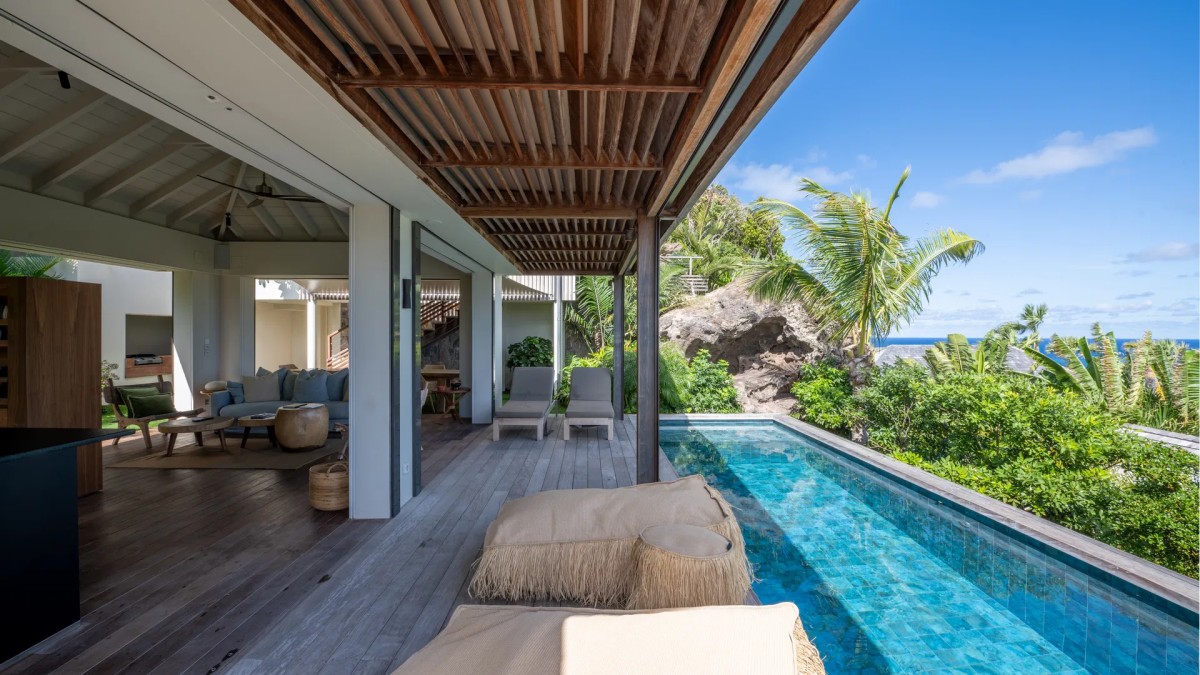 Outside, the expansive terrace centers around a long, inviting swimming pool. Sun loungers and a shaded wooden pergola create the perfect space to relax, sip cocktails, and take in the sweeping ocean views. Stone steps lead to the villa’s lower and upper levels, surrounded by lush tropical gardens and swaying palms that enhance the tranquil, natural setting.