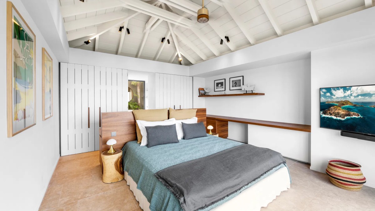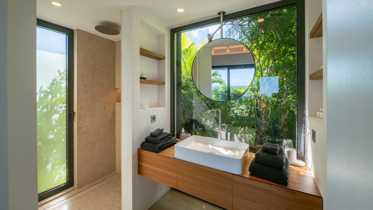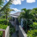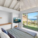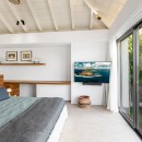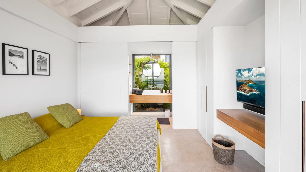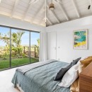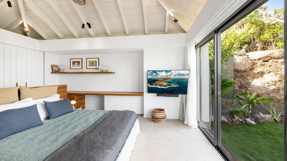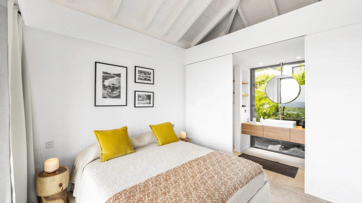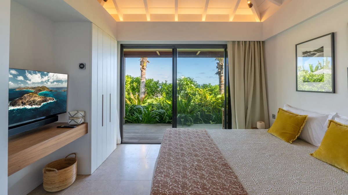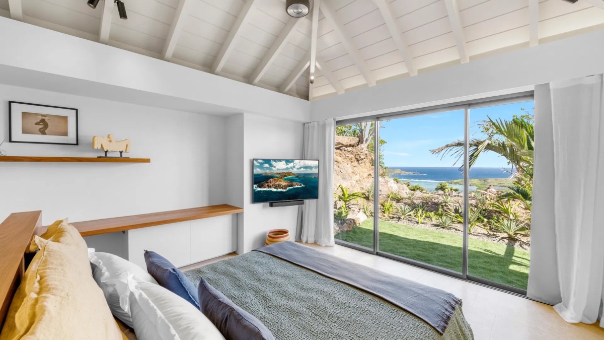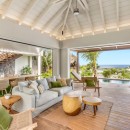 The villa’s three air-conditioned bedrooms each feature en-suite bathrooms and private outdoor showers. Two bedrooms occupy a separate lower-level bungalow with panoramic ocean views, while the third sits above the main level and enjoys both garden and sea vistas. High ceilings, gentle breezes, and tasteful island décor create an ambiance of effortless luxury throughout.