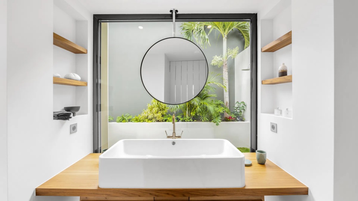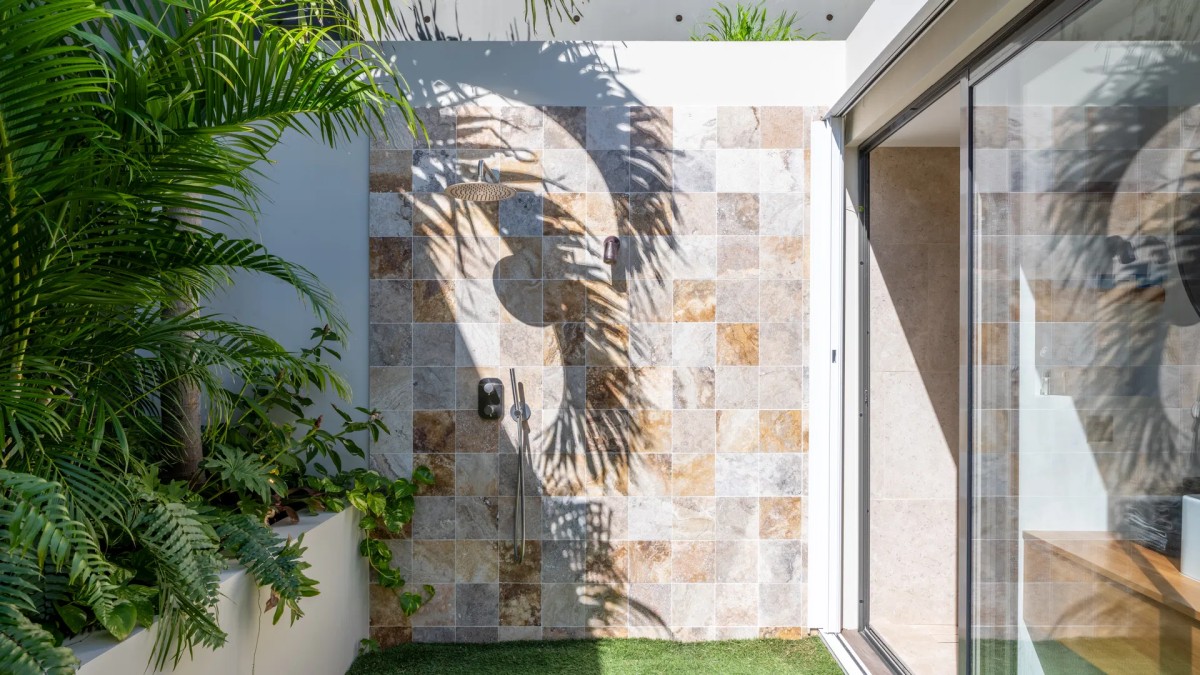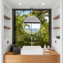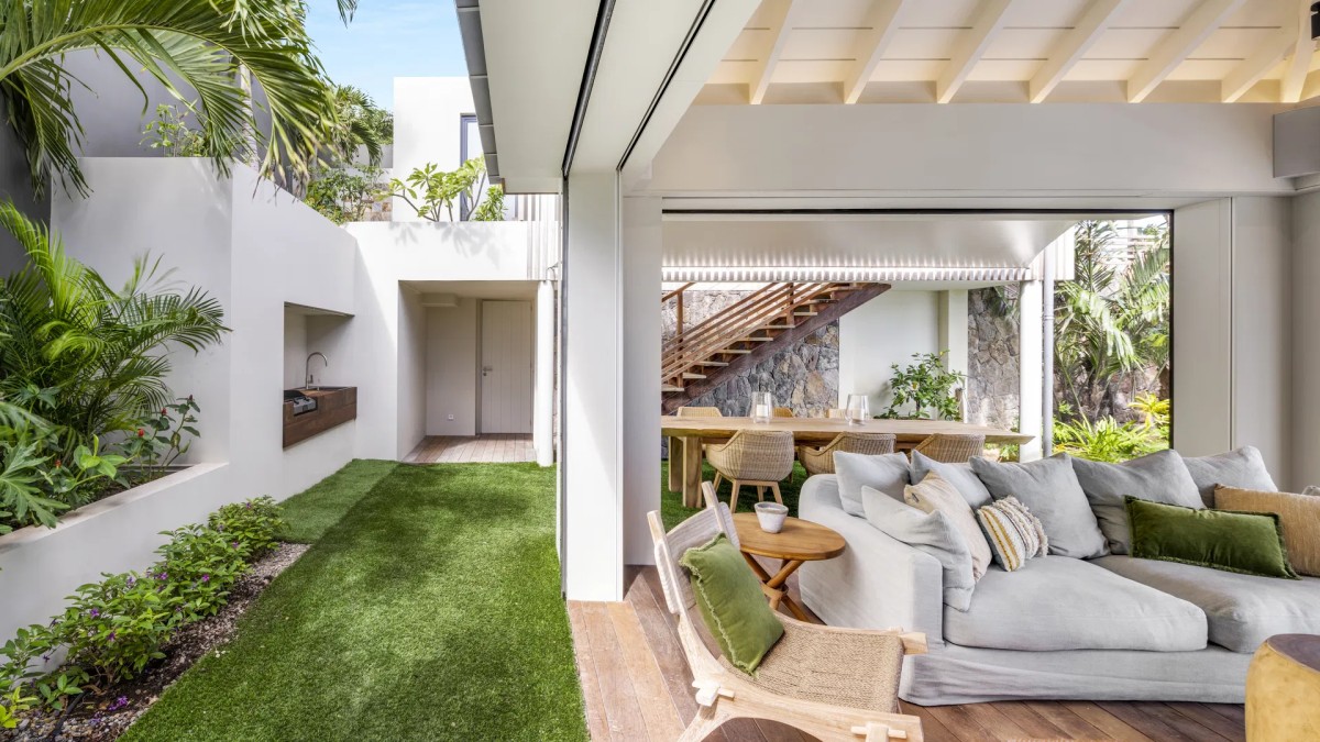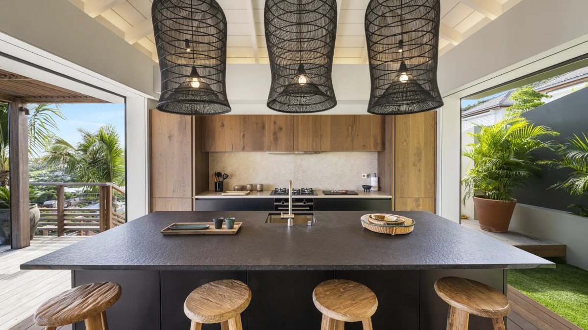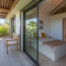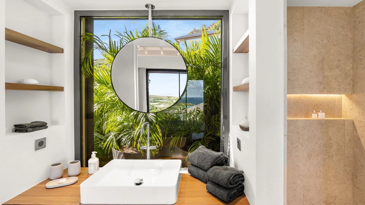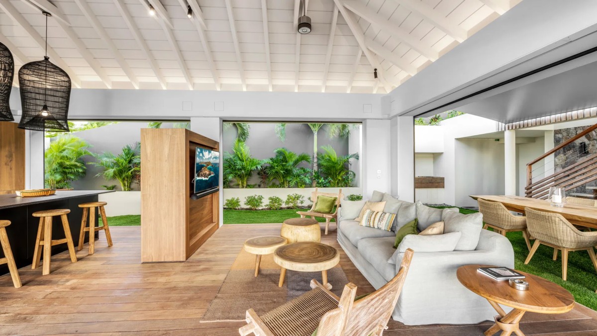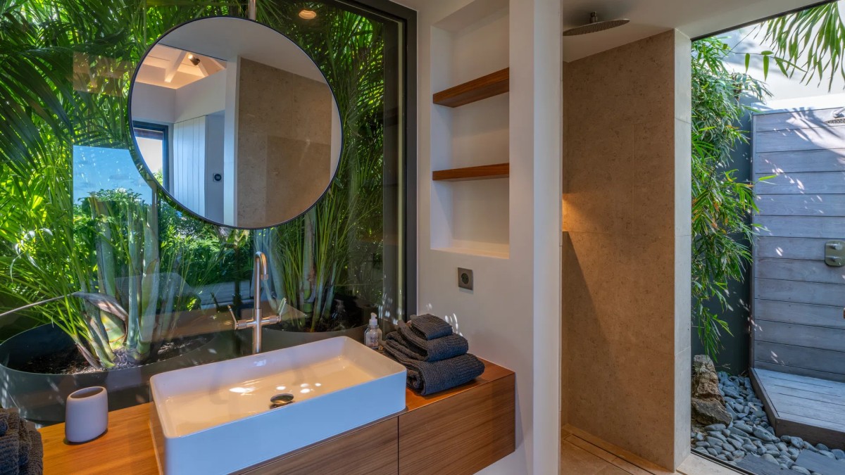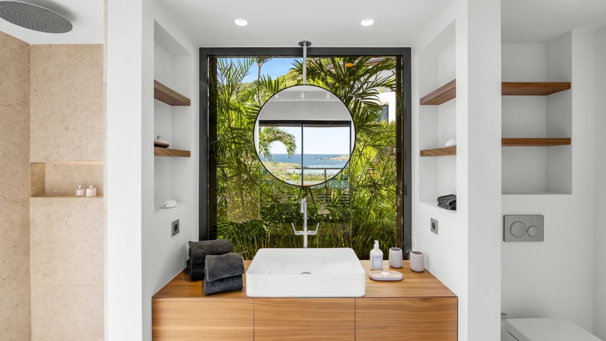The villa’s three air-conditioned bedrooms each feature en-suite bathrooms and private outdoor showers. Two bedrooms occupy a separate lower-level bungalow with panoramic ocean views, while the third sits above the main level and enjoys both garden and sea vistas. High ceilings, gentle breezes, and tasteful island décor create an ambiance of effortless luxury throughout.