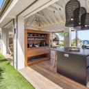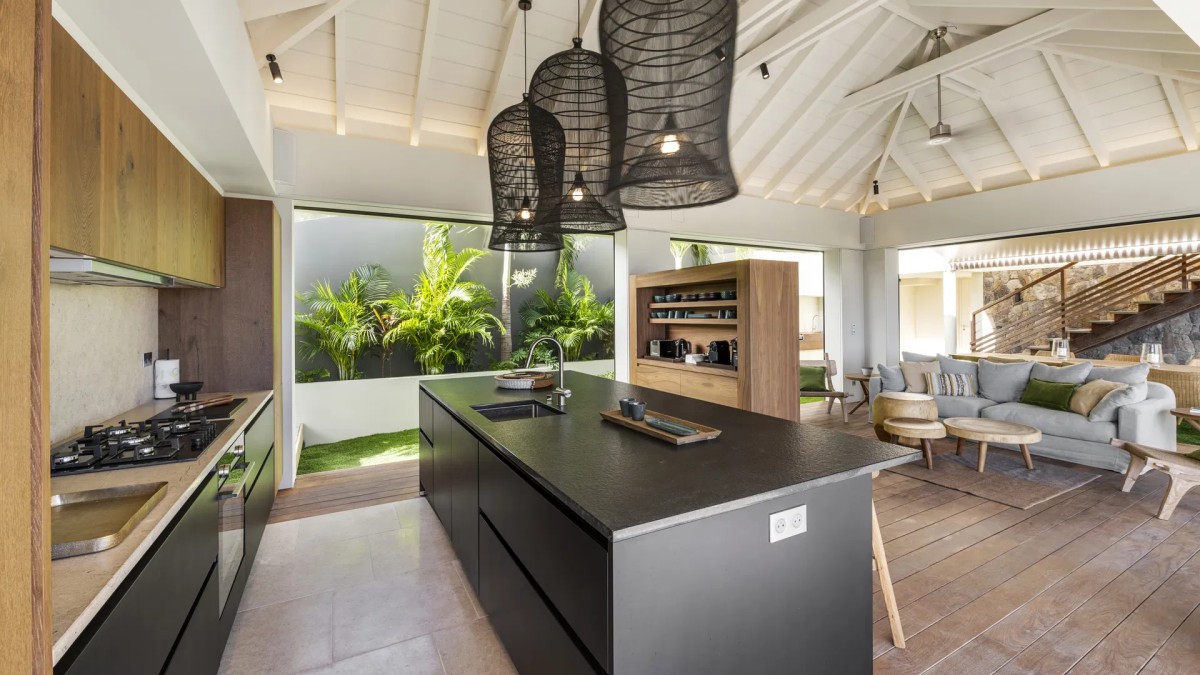 Spread across three separate buildings, Villa Kaz combines open-air living with refined comfort. The main level features a breezy living room open on three sides, furnished with a plush sofa and HDTV beneath a vaulted ceiling. Adjacent is a stylish dining area with rattan seating overlooking the terrace and the turquoise lagoon beyond. The fully equipped kitchen opens to both the front and rear of the villa, with an additional prep kitchen conveniently located nearby.