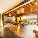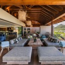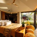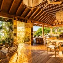 The main floor features a magnificent covered terrace that overlooks the heated infinity pool and the azure blue lagoon, perfect for leisurely days, dining with a view, or socializing with friends. Adjacent to the terrace, an air-conditioned living room extends outdoors, offering a second dining area, a fully equipped kitchen, and a cozy lounge. An upstairs bedroom is accessible from this living space, while the remaining three bedrooms each have private entrances from the main deck.