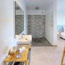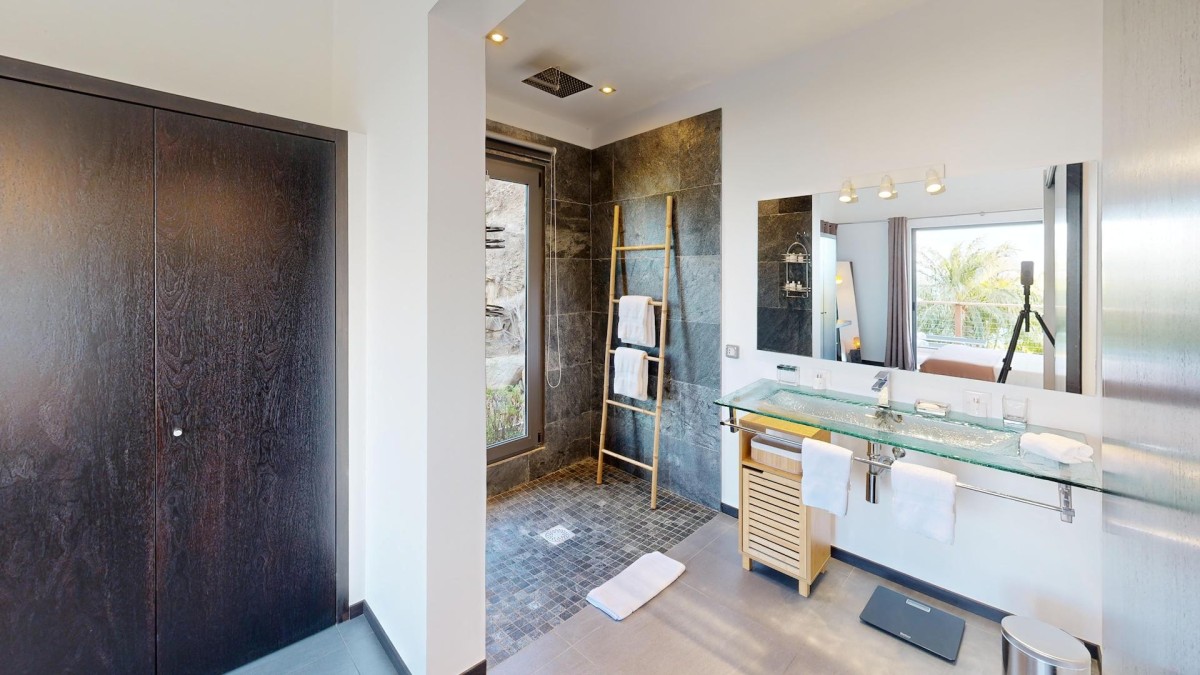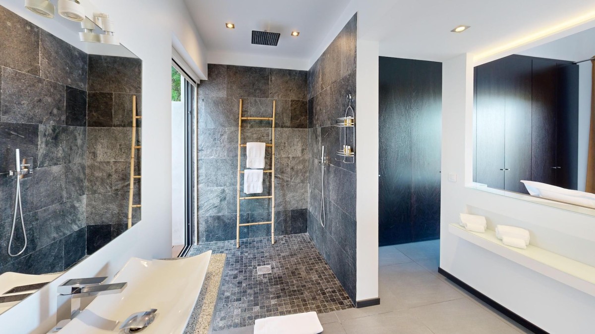Designed for both comfort and privacy, Villa Nita features two equally sized en suite bedrooms flanking the main living space, while a third en suite bedroom—complete with twin beds that convert to a king—is tucked away on the lower level, offering its own secluded terrace.