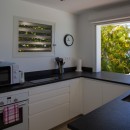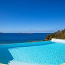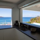 The terrace features enormous glass doors that merge the lines between interior and exterior spaces, ensuring you savor those sea breezes and the non-stop scenery. This includes the kitchen, which opens to the pool terrace as well as being open to the great room area as well. It is a fully-equipped space with a unique palette of blue countertops and white cabinetry, making it as airy as the rest of the property.
