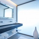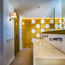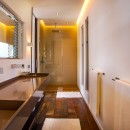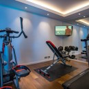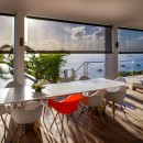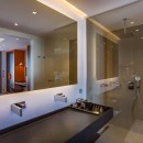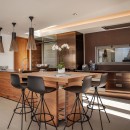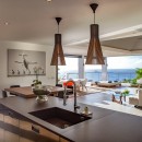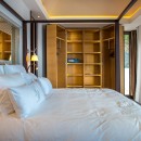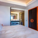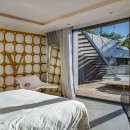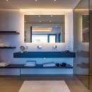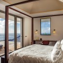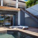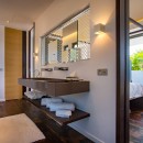 The shared living spaces are equally luxurious and include the enormous expanse of pool terrace, a great room, a fitness room, games room, and more. The pool is one of the most appealing places to linger as it includes an amazing array of indoor and outdoor spaces. Oversized platform sun beds, banquette sofas and oversized chairs line the deck. At one end is the covered terrace, and beneath it guests can relax at the al fresco dining table or additional lounging areas.
