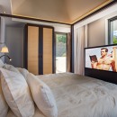 Bedroom 5 (Bulgari): Lower floor bedroom with a queen-size bed, A/C, ceiling Fan, HDTV with Dish Network, iPod dock, safe, private terrace and en-suite bathroom with shower, double vanity and wc. 2 guests maximum. Jacuzzi is located nearby.