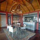 Yet, the interiors are as impressive as the outdoor spaces, and visitors marvel at the beauty of the great room. With high, wooden ceilings and richly stained wood floors, it has a remarkably natural and organic feel. It contains the cozy living room and media space at one end and the formal dining area at the other. The dining room opens into the kitchen, which is well-appointed with the very best appliances and kitchen gear.
