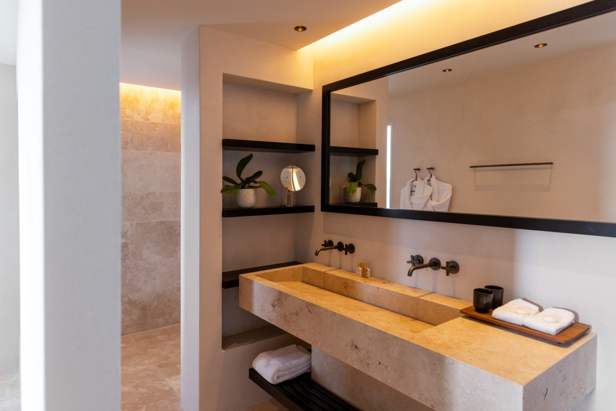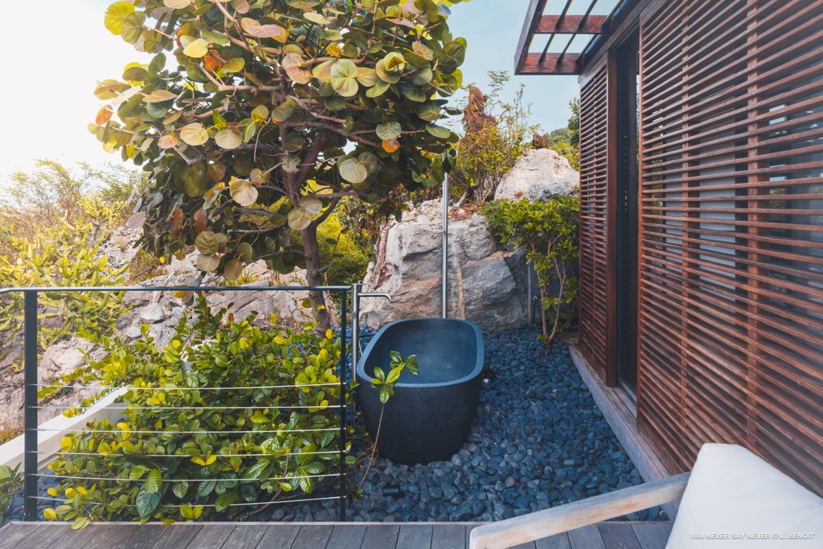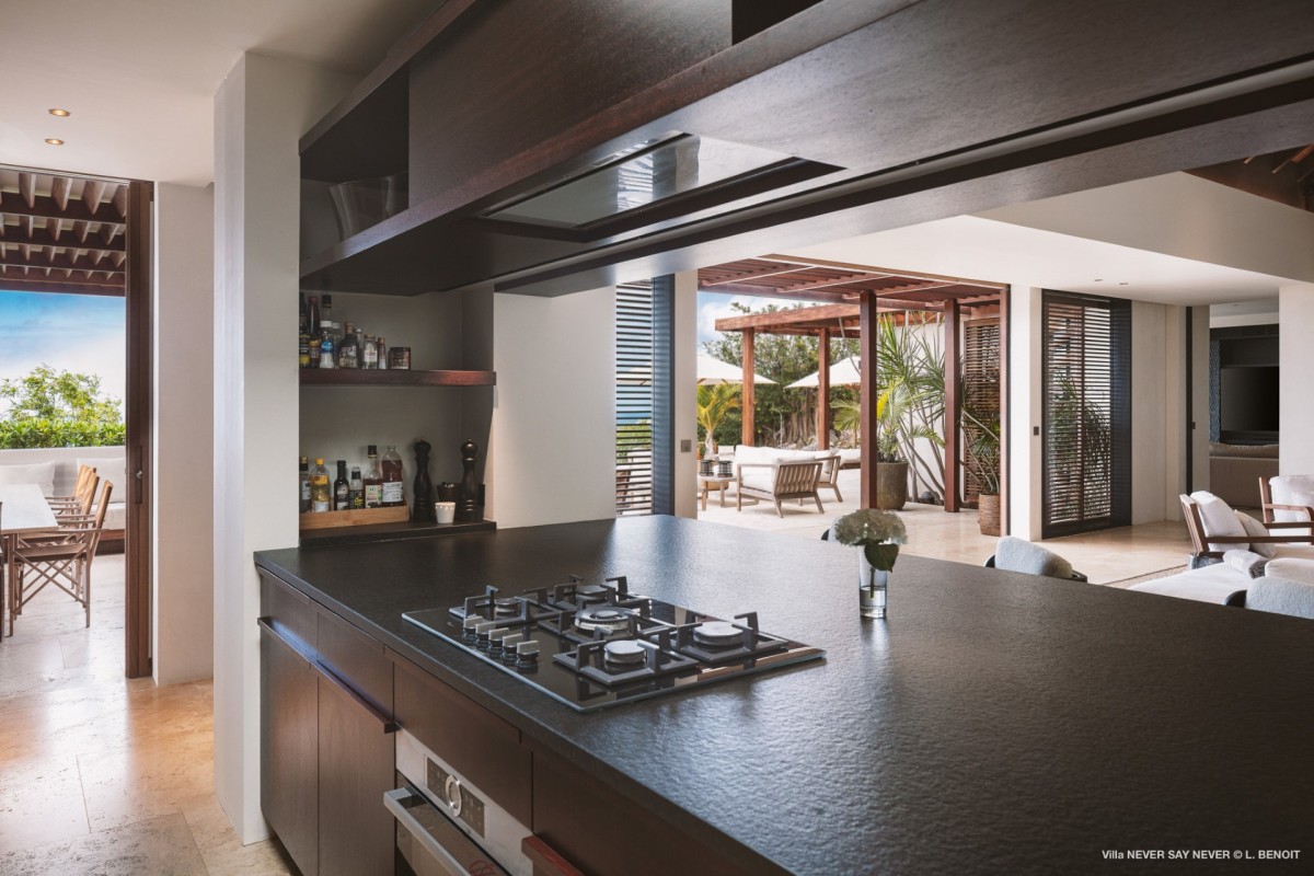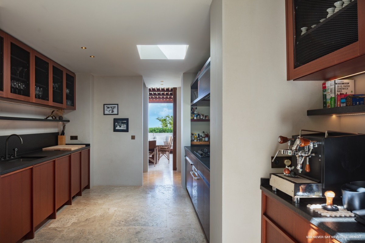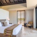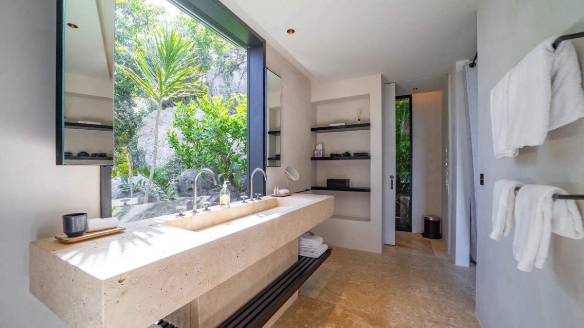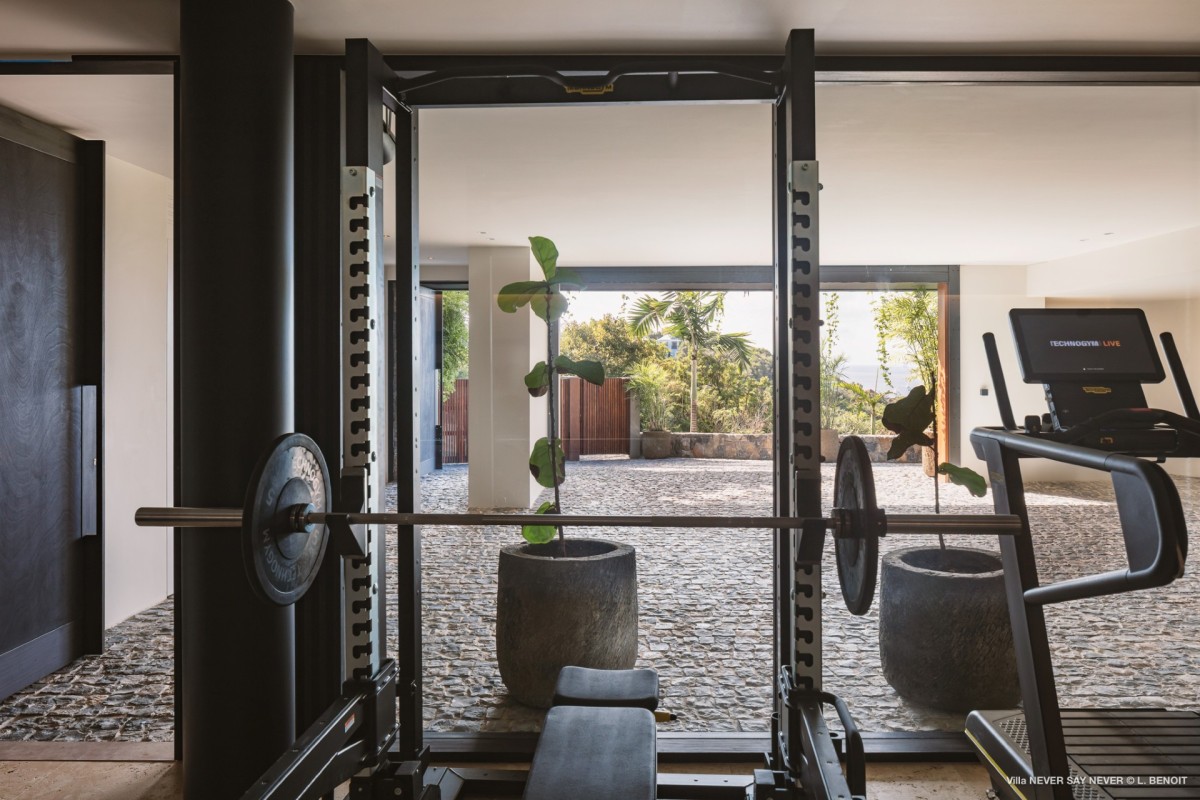 Villa NEVER SAY NEVER features four air-conditioned bedrooms, each with a king-size bed and en-suite bathroom, harmoniously distributed throughout the property. Two bedrooms are located on the upper level, accessible via the staircase from the cinema lounge. The third bedroom is on the main level near the pool, while the fourth is on the lower level, accessible from the staircase near the enclosed parking. Each bedroom enjoys magnificent ocean or garden views and refined décor in soft, soothing tones, creating intimate sanctuaries of comfort and tranquility.