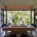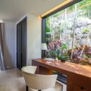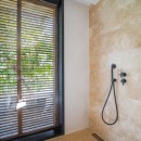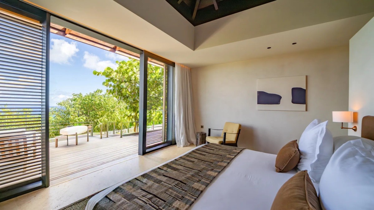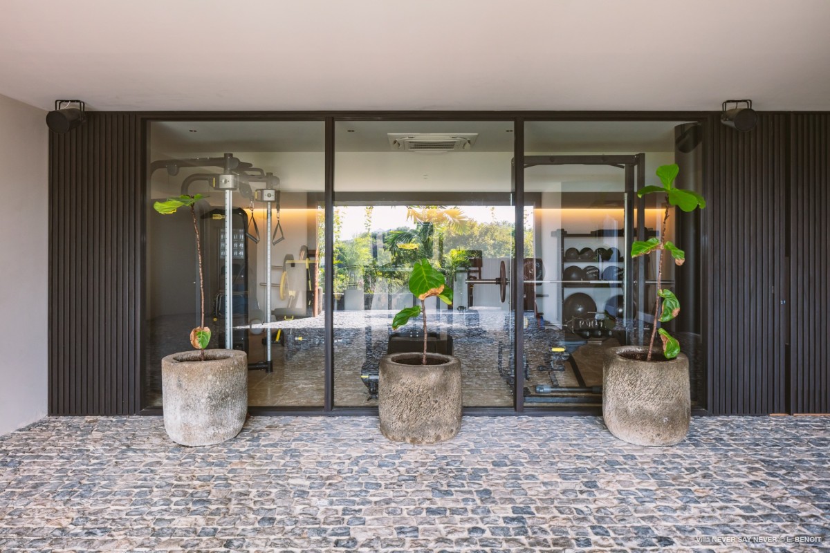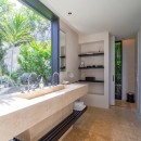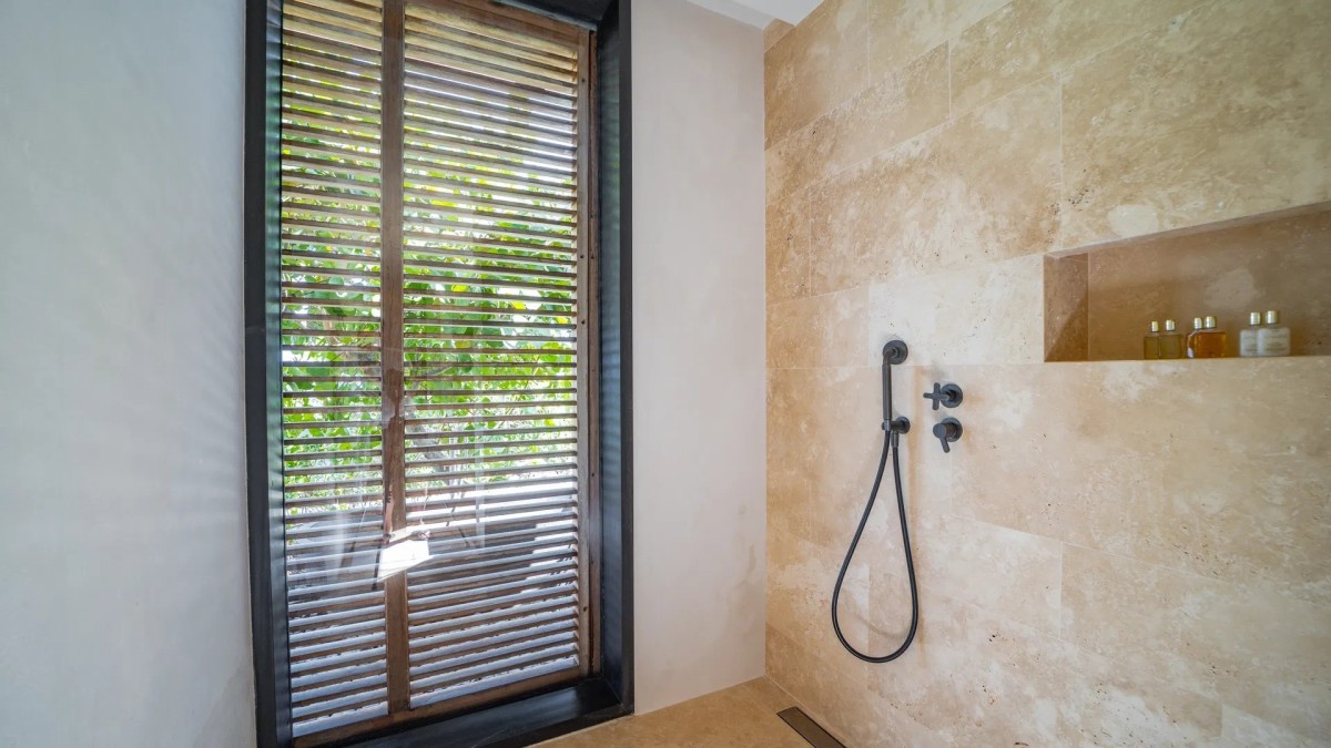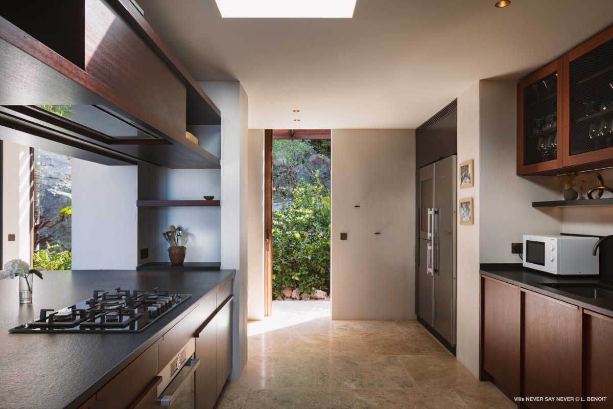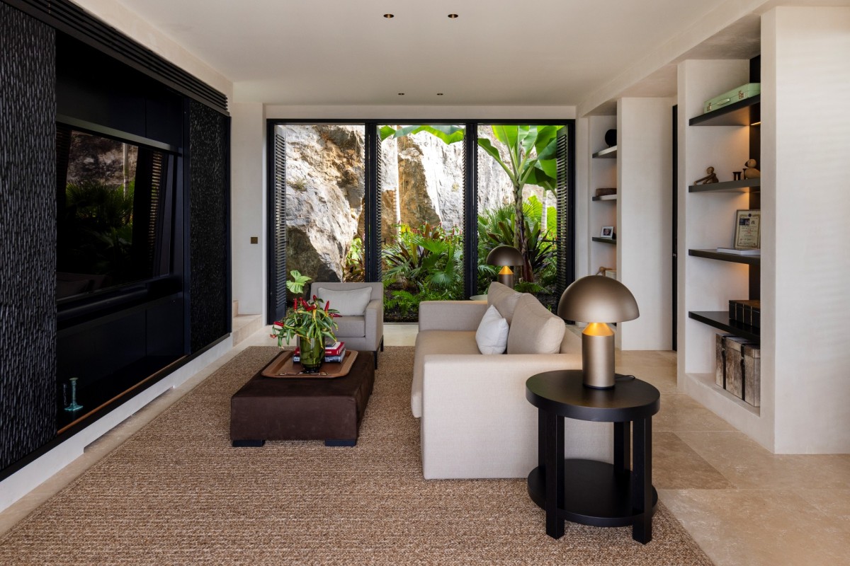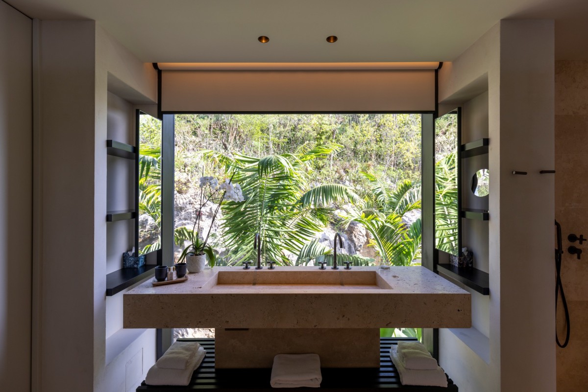 Villa NEVER SAY NEVER features four air-conditioned bedrooms, each with a king-size bed and en-suite bathroom, harmoniously distributed throughout the property. Two bedrooms are located on the upper level, accessible via the staircase from the cinema lounge. The third bedroom is on the main level near the pool, while the fourth is on the lower level, accessible from the staircase near the enclosed parking. Each bedroom enjoys magnificent ocean or garden views and refined décor in soft, soothing tones, creating intimate sanctuaries of comfort and tranquility.