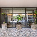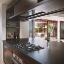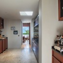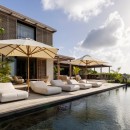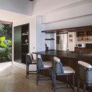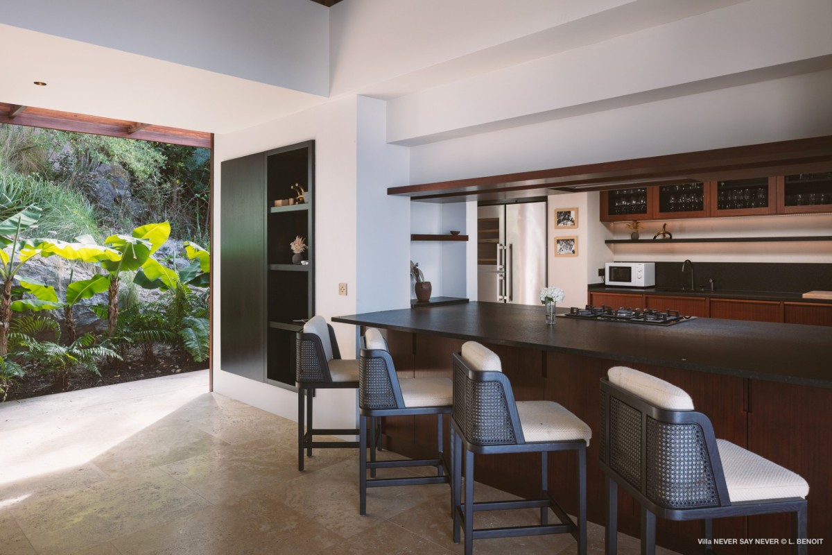Spread across three levels, the villa is a true haven of peace in the heart of the Caribbean. At the front, the luminous living room opens directly onto the pool terrace, while the rear of the space reveals a tranquil oasis of natural stone and tropical vegetation. Furnished with plush sofas, elegant coffee tables, and comfortable armchairs beneath a stunning vaulted ceiling, the living area radiates softness and sophistication. Nearby, the fully equipped kitchen features a central island with pendant lighting and a dining area for eight guests, ideal for both casual breakfasts and convivial dinners. At the back of the villa, a second air-conditioned lounge with a large screen provides a cozy, private setting for movie nights in an atmosphere of total calm.
