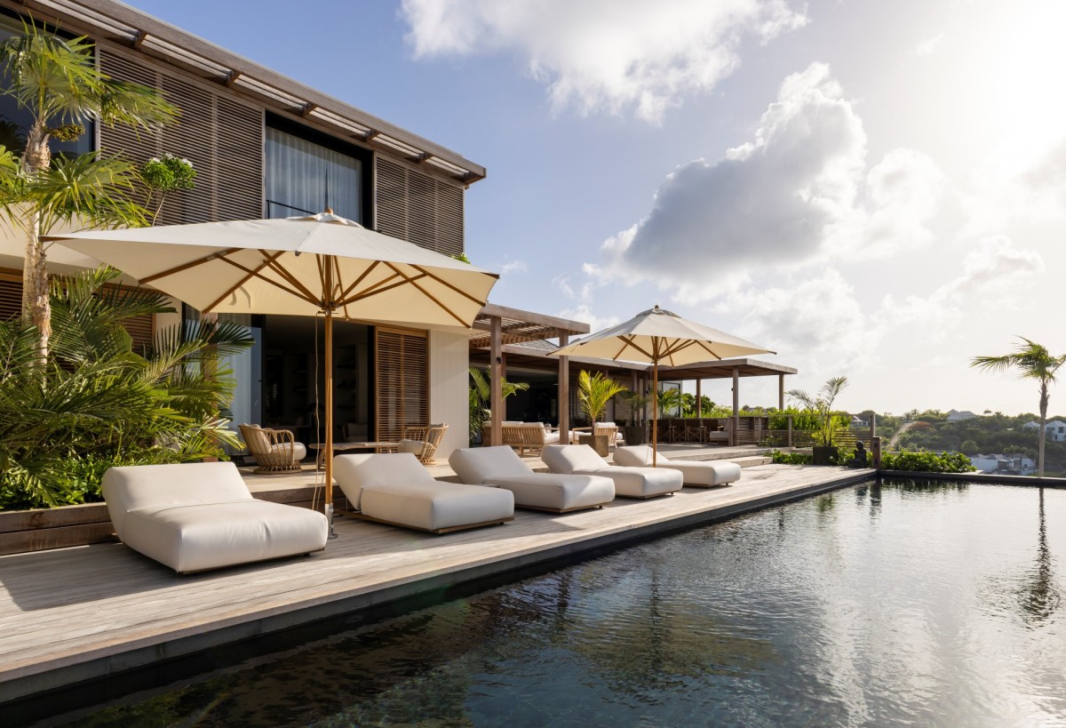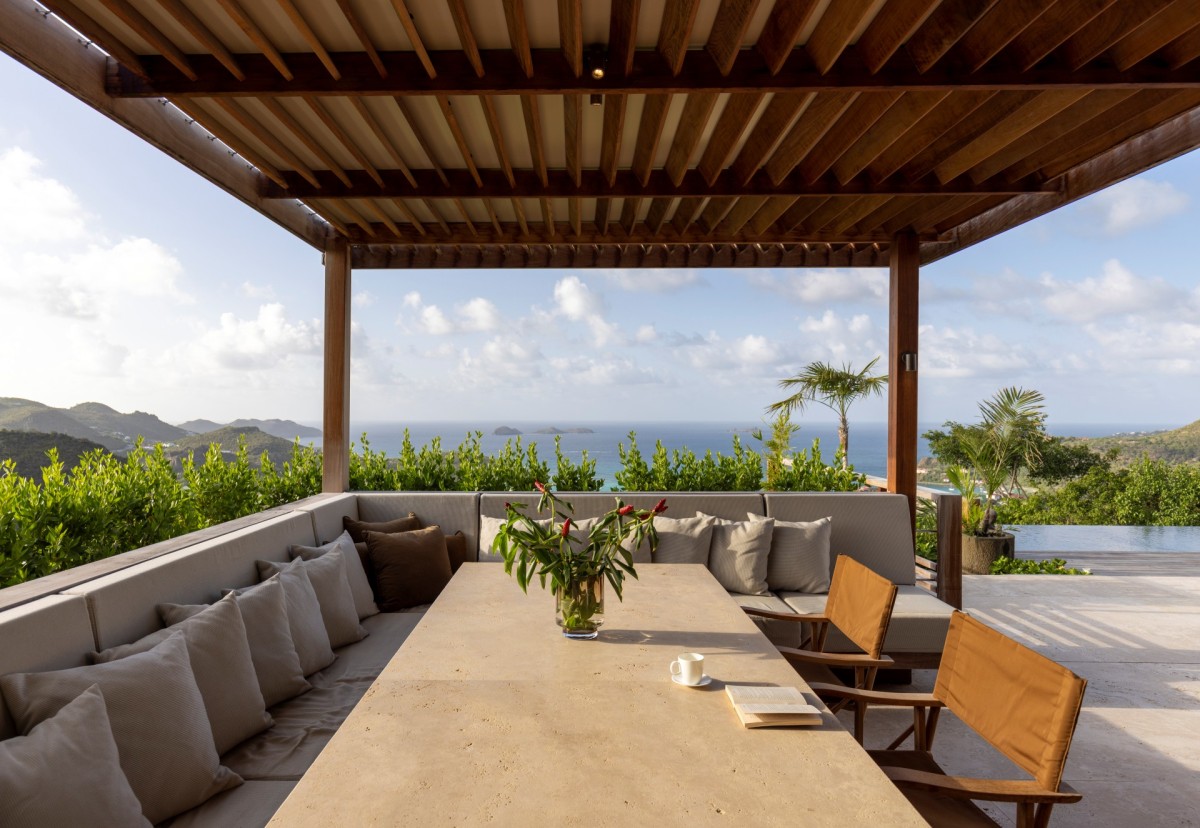 The expansive front terrace is centered around a spectacular 18-meter heated swimming pool shimmering under the Caribbean sun. Cushioned loungers beneath parasols invite long moments of relaxation while facing the horizon. At the far end of the terrace, a pergola shelters the al fresco dining area furnished with benches, armchairs, and soft cushions, all overlooking the ocean. Two additional armchairs placed across the pool offer an extraordinary vantage point over the translucent waters of St-Jean Bay, creating a truly magical setting.